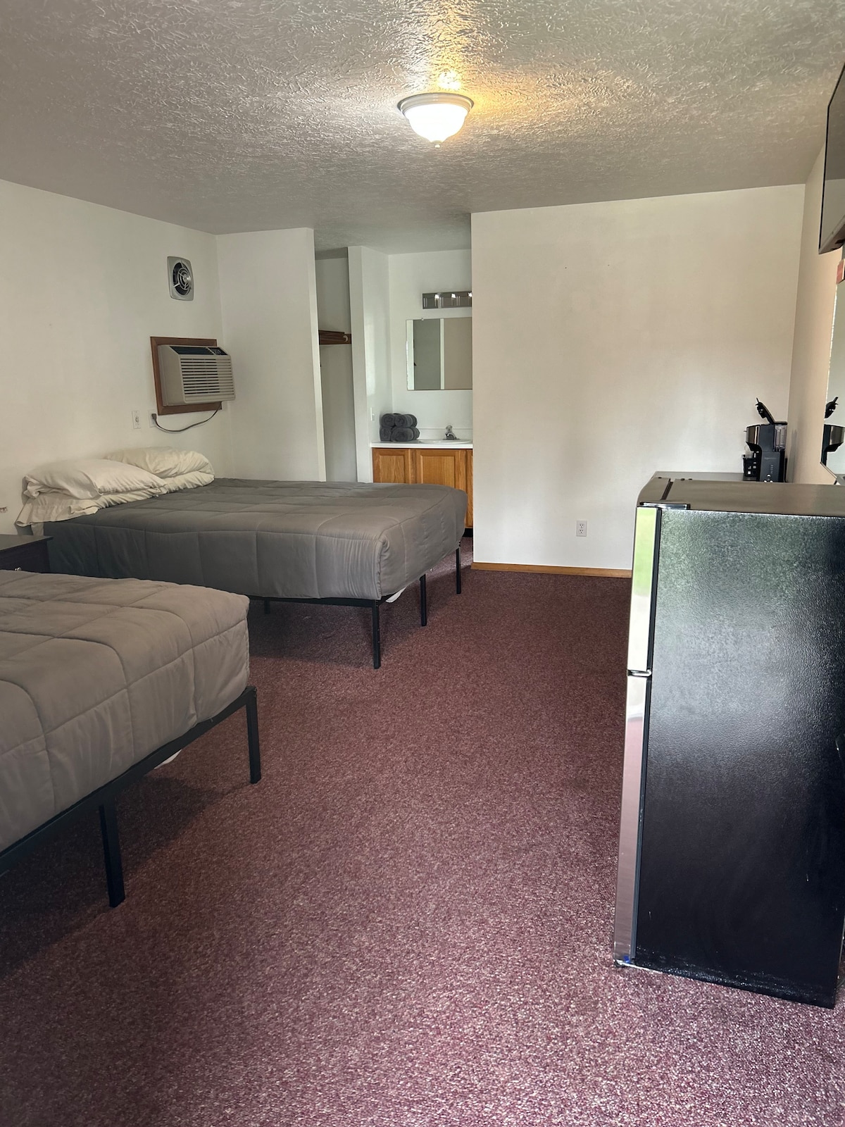 Freshly remodeled (2022) wolf themed suite. Brand new beds! Convenient location, near downtown festivities and close to the freeway entrance. This room is unique compared to our other rooms as it has a queen bed and futon, plus a private room with a king size bed! So this can comfortably sleep 6. Great space for family. If you are looking for something smaller please check out our other rooms listed at Lake Village Lodge.