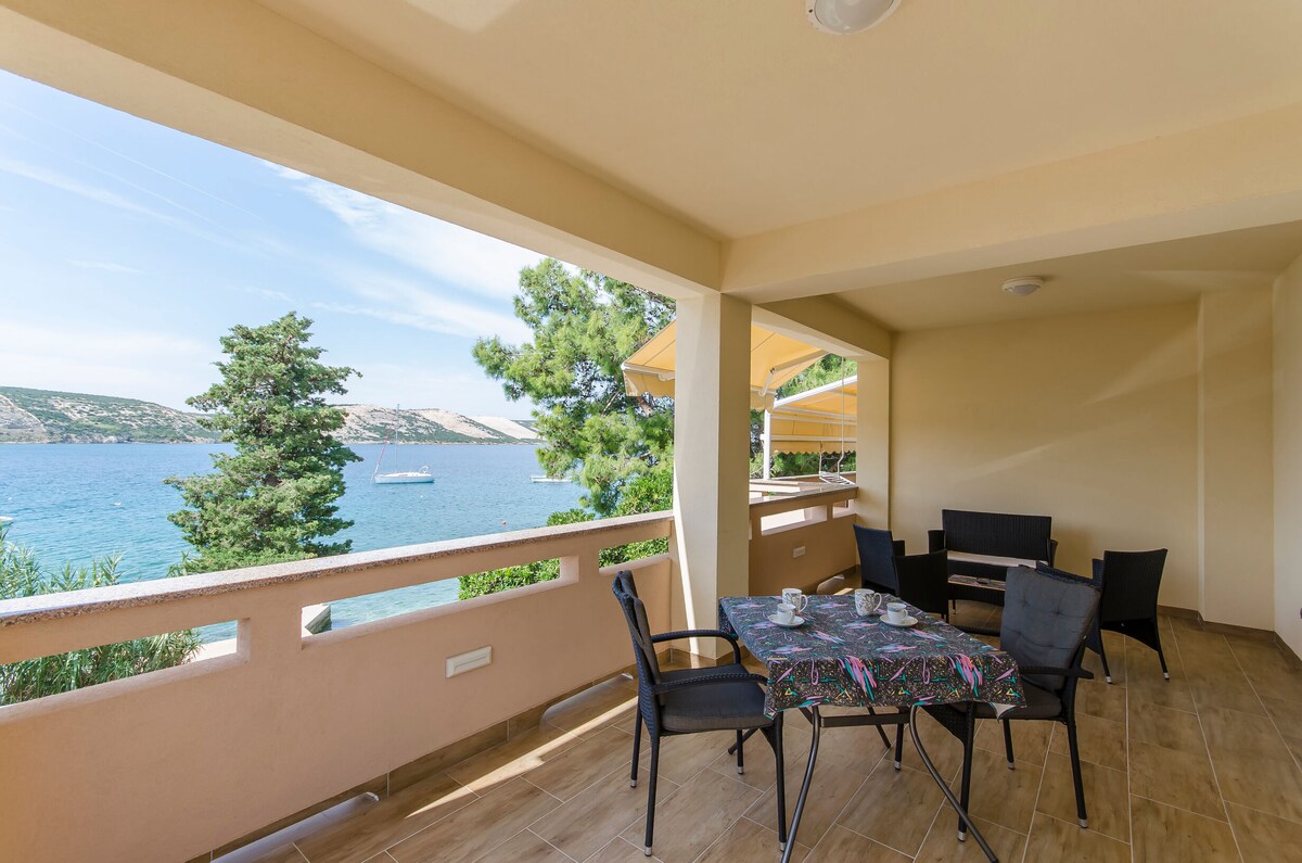 Perched on steep rocks, 30m above the sea level, this idyllic studio is a perfect getaway for a much needed vacation. Surrounded by a vegetation reserve of Dubrava-Hanzine, it offers a luxurious experience - the sweeping views of the Pag Bay and the mountain range of Velebit, for one. Beach Rozin Bok 50m from the apartment. Parking, A/C, outside grill, and outside solar shower included. SUP and kayak are available during the stay in the apartment.