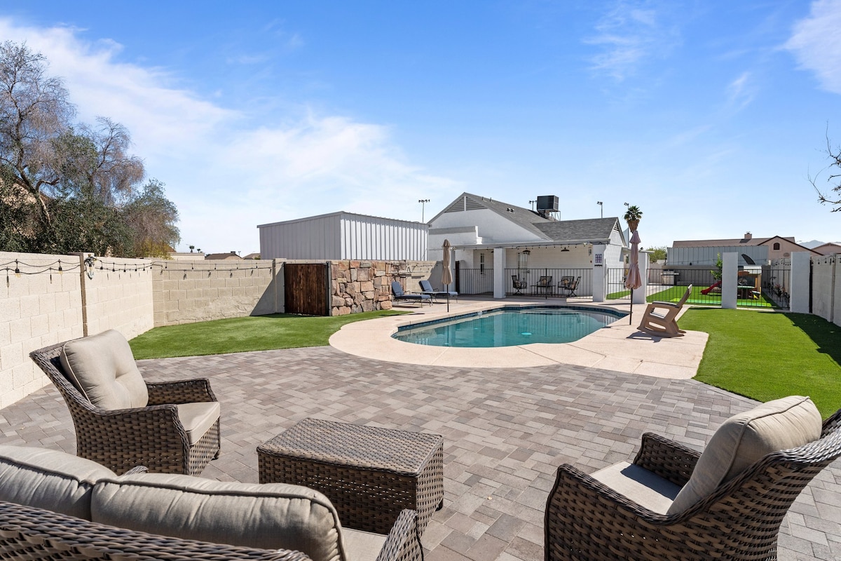Family friendly Entertaining Home; Large covered patio with plenty of seating, fire table, Treager grill, 10ft private heated pool Oct-May (included). Fully stocked chefs kitchen- double ovens, gas cooktop. Comfy beds, smart TVs in all bdrm’s . Baby/kid items. A perfect location for your Arizona getaway. Only 0.8 miles from the State Farm Stadium, Desert Diamond, Westgate, restaurants and adventures avoid traffic walk to your event! Weekly/Monthly discounts. Essentials for your stay provided.