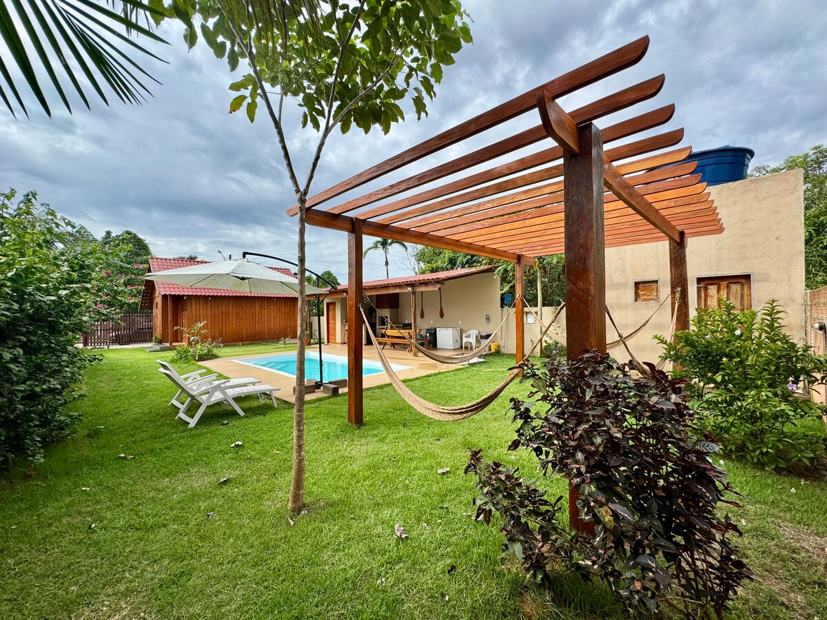 Vi koji želite provesti ugodno vrijeme na drveću na površini od 20.000 m2 u blizini centra Porto Velha u kući održive izgradnje, s pilićima u dvorištu,pticama i očuvanom amazonskom vegetacijom, sa svom udobnošću. Klima uređaj, TV, krevet, posteljina i posteljina za kupanje te prostor za roštilj. Imamo mali bazen dimenzija 2 x 2 m s vodenim mlaznicama, nema funkciju grijača, samo hladna voda. Sve ovo vas čeka.