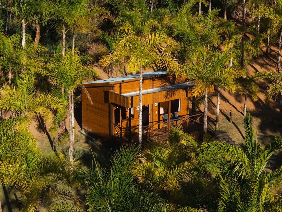Minimalistička brvnara s punim pogledom na Pedra Azul, na najboljoj lokaciji Gušterove rute. Široka podna kuhinja u svim okruženjima, uz potpunu integraciju s prirodom. Ima spavaću sobu s bračnim krevetom, vodoravnu viseću ležaljku okrenutu prema kamenu i dnevnom boravku - kuhinju s kaučem na razvlačenje. Klima-uređaji (grijanje i hlađenje zraka) i kompletna kuhinja. Vanjski prostor ima tradicionalni stol za piknik, hidromasažnu kadu na drva, mini parilu i ognjište.