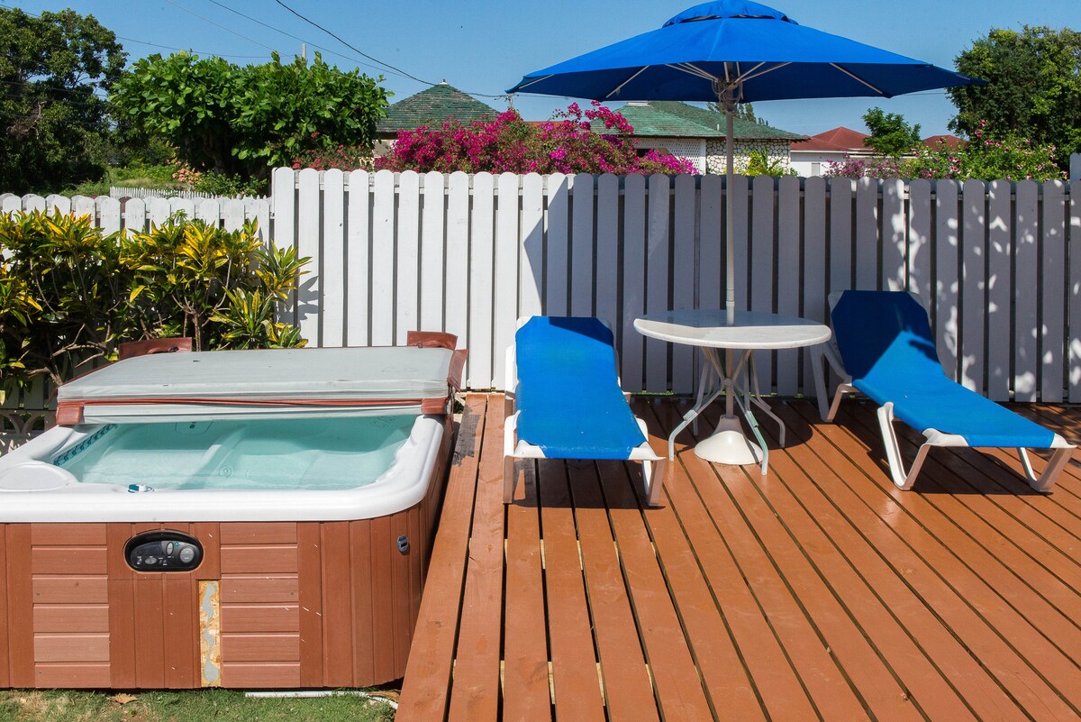 Sigurno prijateljsko područje. Vožnja do aerodroma 30/1-2 $ + $ 10 pp. Ulaz na verandu, dnevni boravak/trpezarija, 2 spavaće sobe, 2 kupatila; pristup visećoj ležaljci, krovni salon. U blizini supermarketa, prodavnica kuhara, taksija (1 USD po osobi/130 JMD)10 minuta do muzeja kulture usred grada i besplatne plaže Harmony, pijace, autobusa. Zatim prošetajte ili taksijem za 1 $ do trgovina, plesa, objedovanja, plaže Dr Cave. Savjeti: JM&Rastafari kultura/historija, zdravlje. Bonus 4 naknada: Detox, obilasci, masaža, pletenje kose, obroci/čas kuhanja, fizikalna terapija! Kliknite na fotografiju domaćina za još 4 rms.