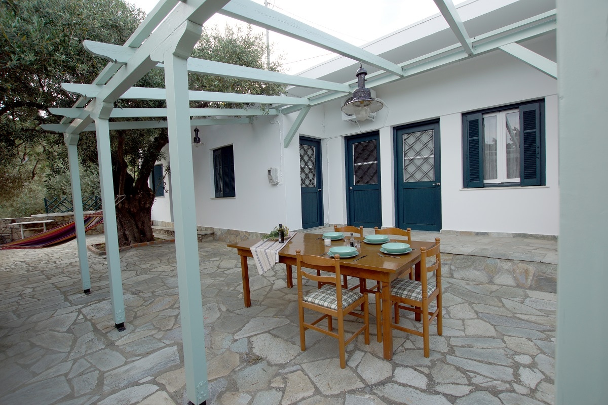 We offer a seaside house in one of the most beautiful and secluded bays of Alonnisos. Agios Petros Bay is located at 9km away from Patitiri, the island’s port. The old family vacations’ house, is renovated and made to offer you a peaceful environment. The house consists of 2 large sitting rooms and fully equipped kitchen. It also has 4 large separate bedrooms and 2 toilets. An extra sofa bed (or a baby crib) can be added, free of charge, if an extra guest is to stay at the house (6 guests +2).