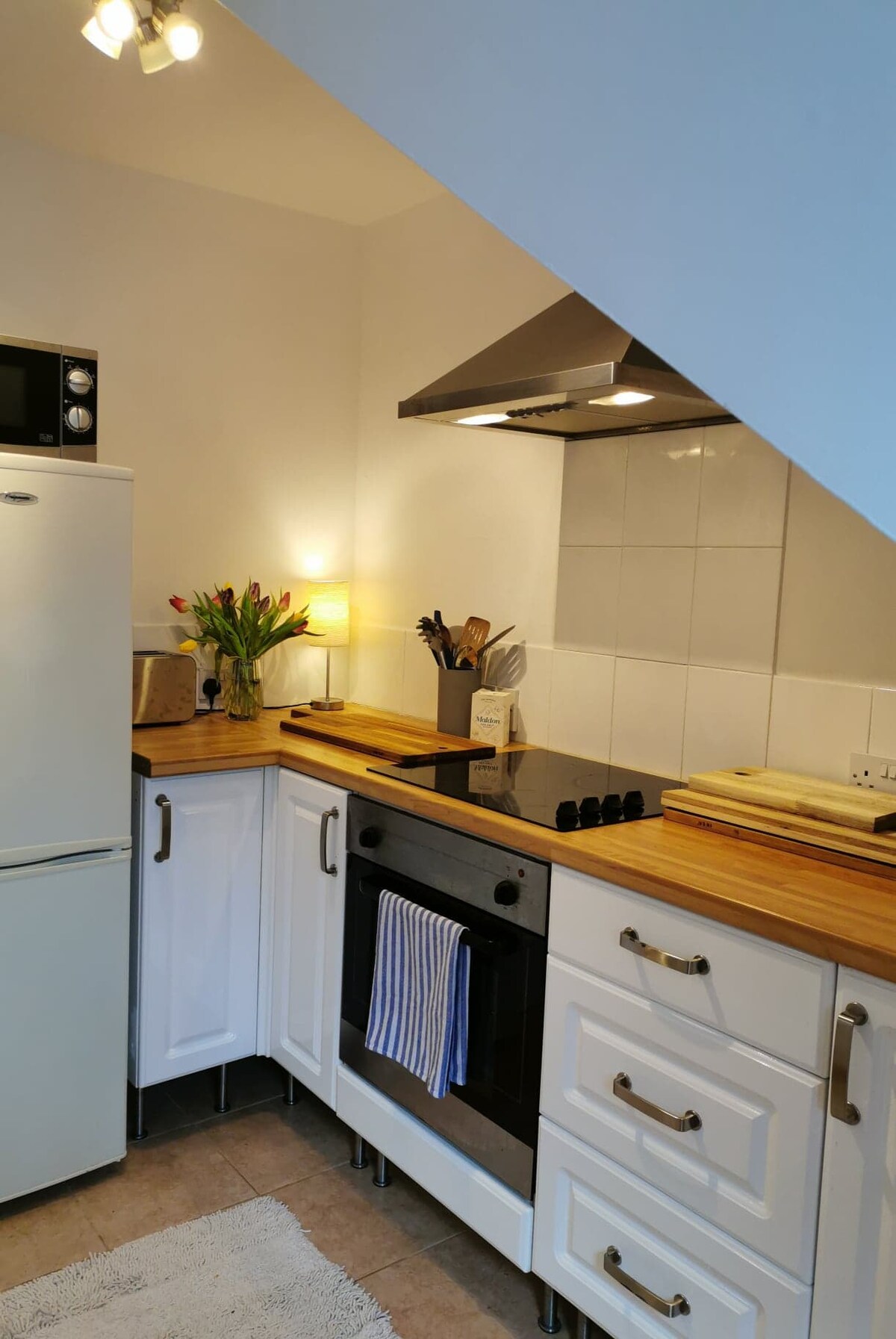 Prizemlje, North Flat, Red Lodge Prostrani stan u prizemlju u srcu Tarberta. Smještaj Nivo ulice Prizemlje, kuhinja otvorenog plana, trpezarija, dnevni boravak, pametni TV od 81cm, WI-FI. Električna ploča za kuhanje i rerna u kuhinji, mikrovalna pećnica, frižider-zamrzivač. Spavaća soba s bračnim krevetom, prostrana s ugradbenim ormarom. WC šolja/mokra soba, moderna prostrana mokra soba s podnim grijanjem. Ormarić U hodniku može SE čuvati 2 bicikla, ZATRAŽITE KLJUČ ZA ORMAR PRIJE BORAVKA ako IMATE BICIKLE ZA ODLAGANJE. 🚴🏻♀️ Na uličnom parkingu.