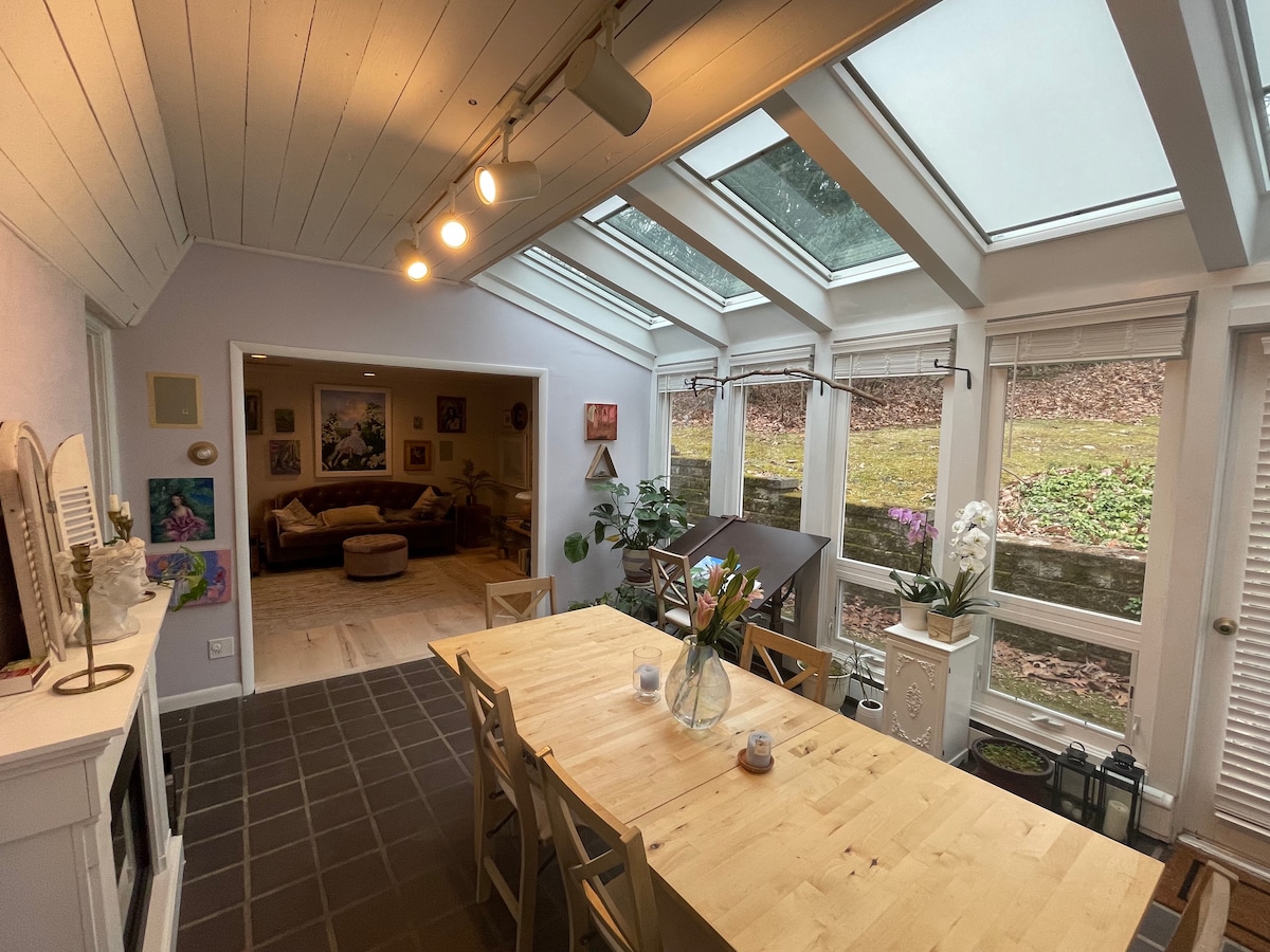 Come here for the feel of a secluded getaway, while staying close to the city. To get to the house, turn off the road onto a quiet cul de sac. Walk through the garden on a path up to the front porch. The back half acre is a lovely scene of green -- grass and bamboo and trees -- which can be enjoyed from the kitchen table. Quick drives to Downtown Wayne, King of Prussia Mall, and Valley Forge National Park. Just a couple minute drive to 202 to get to the city.