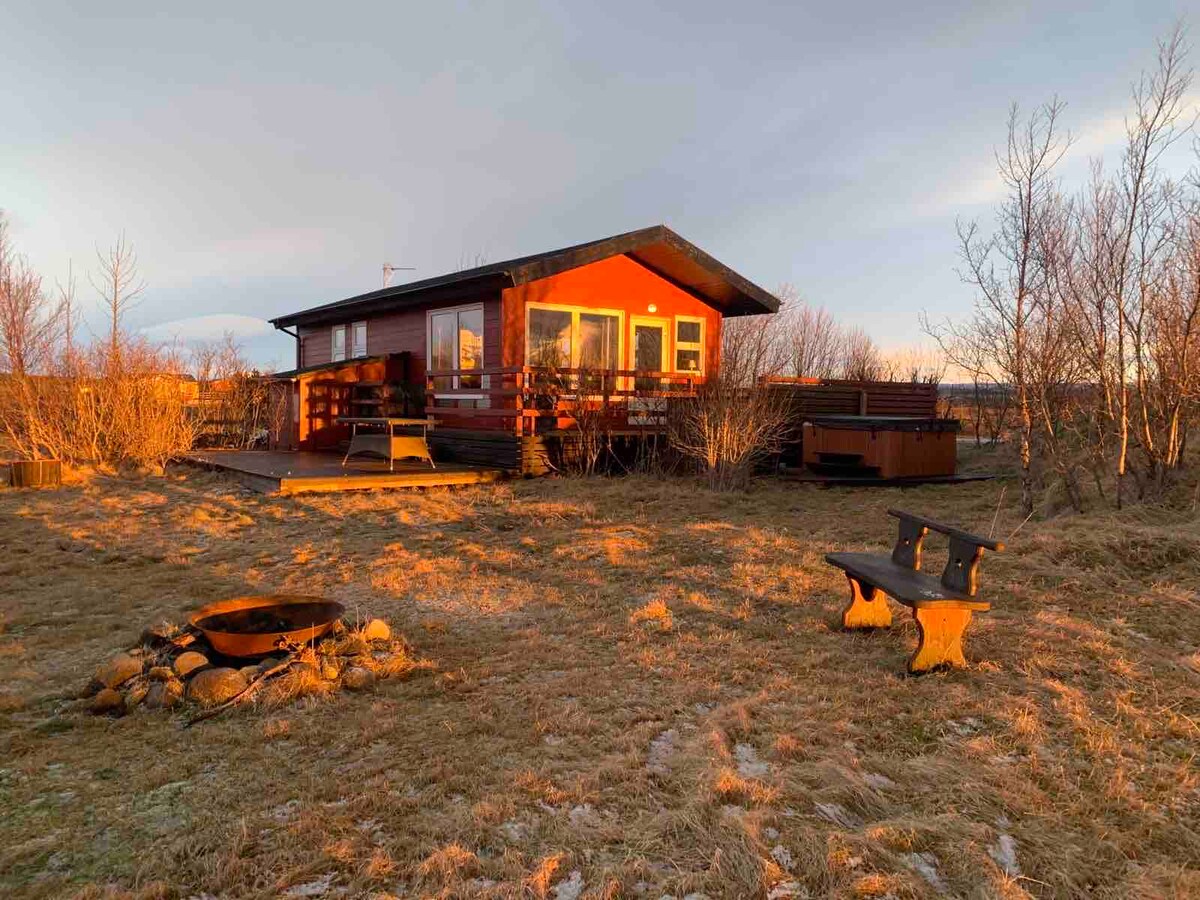Beautiful Luxury cabin located only 1 min drive from world-famous Geysir and it is also a short drive to Gullfoss The cabin is located on a large private ground where you can enjoy Strokkur (the only active Geysir in Iceland) from the cabin. The space 3 bedrooms. The living room and the kitchen make an open area with a high ceiling with a comfortable lounge area with fireplace. All bed linen, towels, soap etc is provided. Free wireless internet available as well.