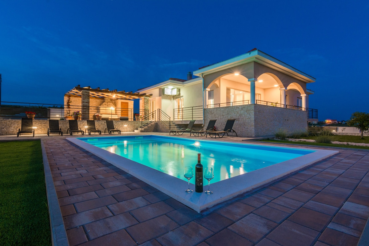 Ova prekrasna vila s grijanim bazenom, masažnom kadom i saunom smještena je na zabačenom i skrovitom pejzažu s pogledom na dolinu koji oduzima dah Grijani bazen od aprila do novembra Odlično mjesto za opuštanje i polazišna tačka za istraživanje regije i Hrvatske! Udaljenost od grada Zadar je udaljen 28 km (aerodrom 20 km) Šibenik je udaljen 50 km Split je udaljen 125 km (aerodrom 99 km) Udaljenost od atrakcije Plitvička jezera udaljena 125 km Krka udaljena 45 km Kornati udaljeni 30 km