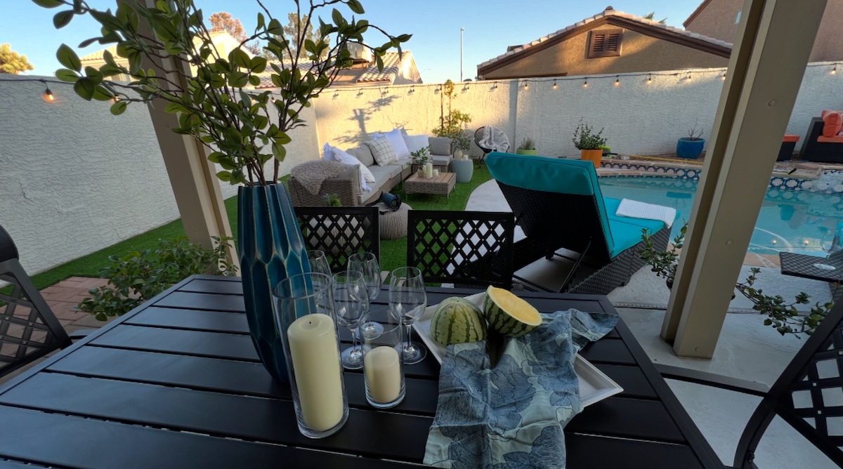 🌴 Long term visitors welcome! Private pool + spa (complimentary spa heating), cardio room, Samsung appliances, and modern upgrades throughout. Typically about 15–20 minutes to the Strip depending on traffic and destination. This 2400+ sq ft renovated home features one-of-a-kind furniture, an 8ft sparkling chandelier, marble-style flooring, and a 75-inch Samsung 4K TV! NOTE: This is NOT a party space. Please be respectful of the rules and the lovely neighbors.