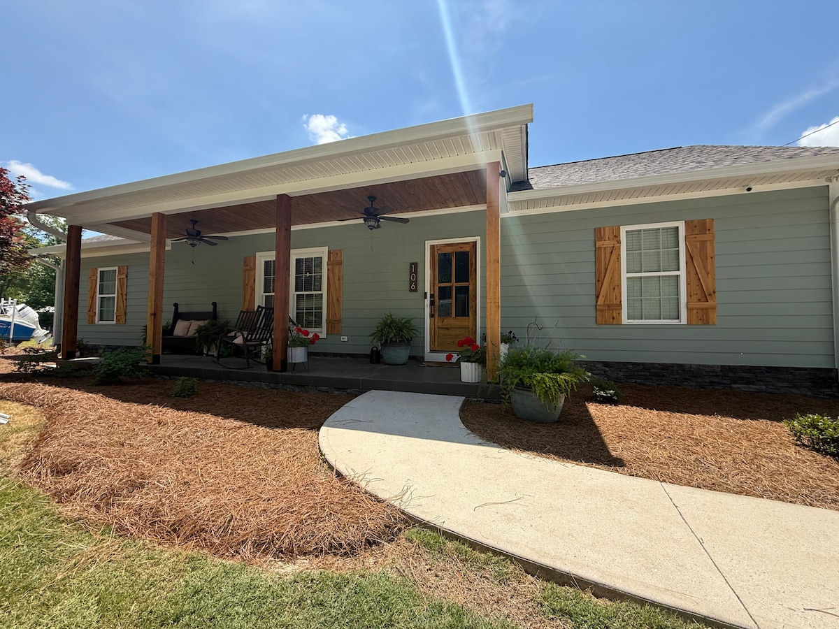 Rustic and cozy lake house with wrap around porch extending over the water on main lake. 3 bedroom, 2 bath with open downstairs floor plan. Plenty of space and all the comforts of home for a last minute weekend getaway or extended stay. Accommodates up to 8 people. Smart Tvs in every room with WiFi, Hulu TV, and ESPN Select. Lots of seating out on the porch as well as the dock, which has fire pit table. Grill, kayaks, life jackets available.