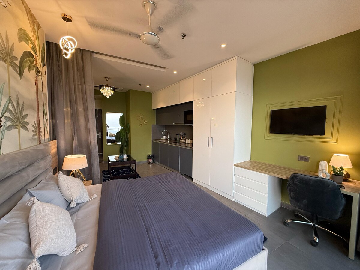 Predstavljamo vam naš izuzetan luksuzni studio apartman: Smješten u srcu grada, ovaj raskošni studio se može pohvaliti modernom elegancijom i neusporedivom udobnošću. Dizajn otvorenog koncepta vas poziva u prostrano utočište, okupano prirodnim svjetlom s velikih prozora s kojih se pruža prekrasan pogled na grad. Ovaj stan se nalazi na 41. spratu u jednom od najviših strugača na nebu u Delhiju - NCR. Stan ima pogled na rijeku s balkona!!