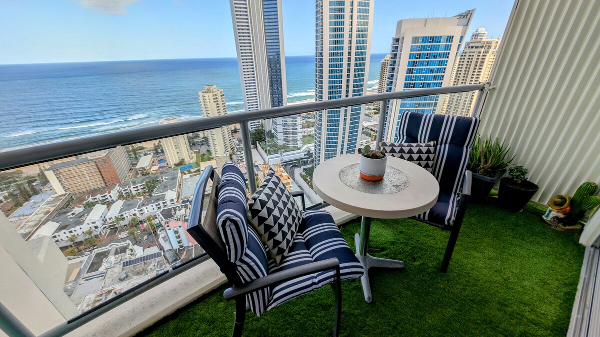 Divite se vrhunskom pogledu na stan u uglu s pogledom na blistavi okean. Smješten na petom spratu, dovoljno visoko da uživate u pogledu na plažu, dovoljno nisko da uživate u gužvi i vrevim aktivnostima na ulici, 10 minuta hoda do zabavnog centra Surfers Paradise, tržnica, šopinga, restorana, klubova, preko puta plaže Surfers Paradise. Stanica lake željeznice 8 minuta hoda. Jedinica ima pametni TV, povežite svoj Netflix, Apple TV itd.