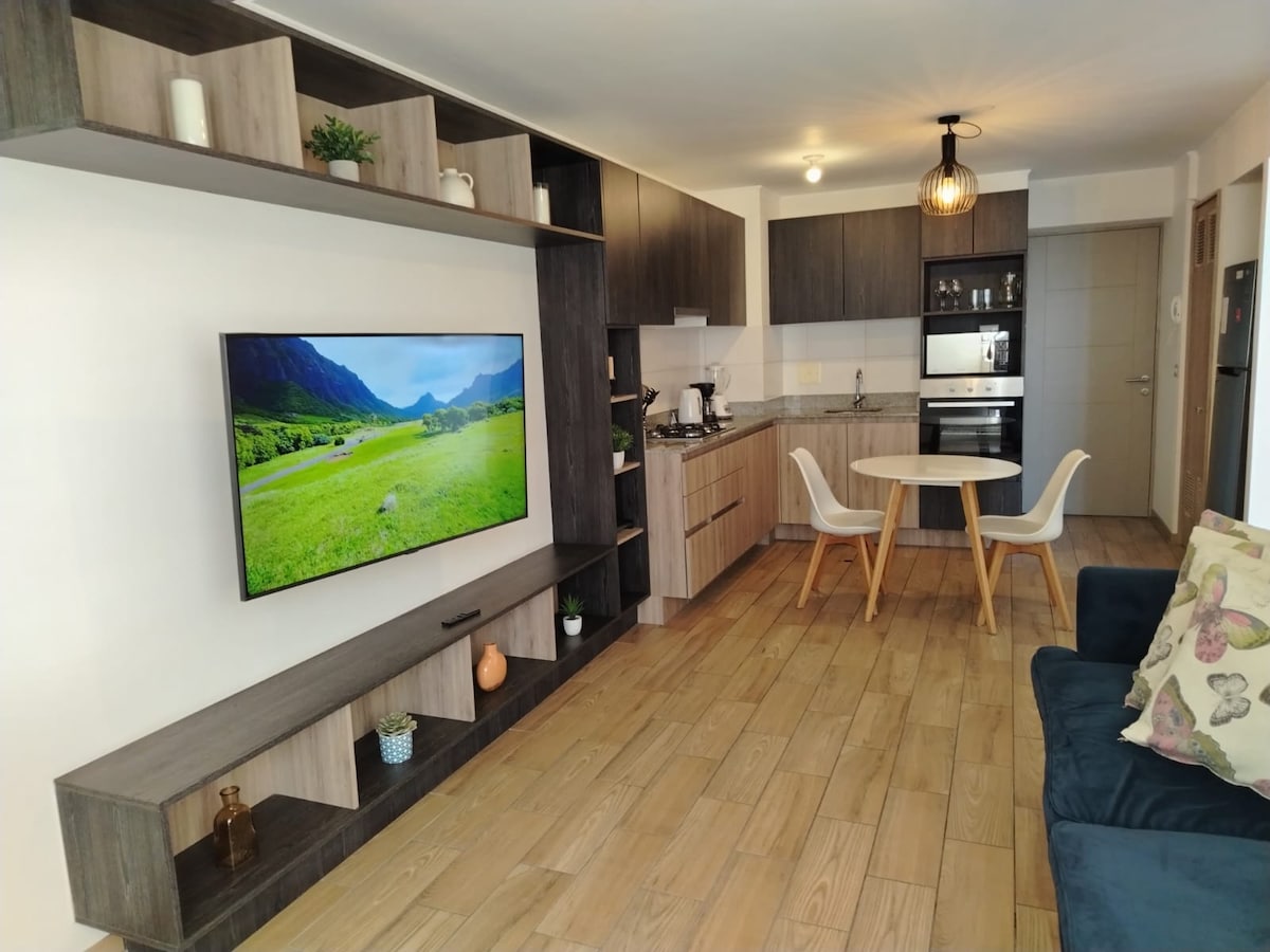 Acogedor apartamento de estreno, excelente ubicación, muy cerca de San Isidro y San Borja. Cuenta con un balcón y amplia ventana, cocina totalmente equipada, con 2 TV, wifi y cable. Tiene piscina, lavandería, cinema, sala para reuniones (zoom), sala de CoWorking, etc. El Edificio cuenta con seguridad las 24 horas del día y tiene facilidad de acceso para discapacitados. Está muy cerca a bancos y al centro financiero de San Isidro. Fácil acceso a cualquier distrito, vía transporte público.