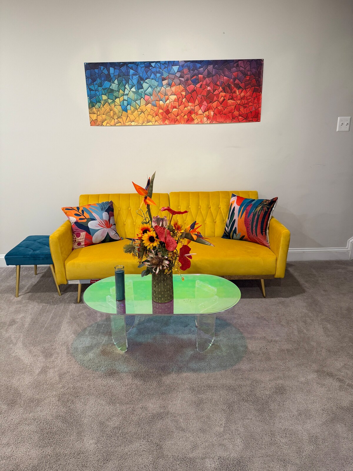 Ovaj poseban smještaj ima retro ugođaj, duboki kauč na kojem udobno spavaju 3 osobe, kauč od baršuna sa zabavnim svijetlim bojama! Zadnja vrata do dvorišta koje gleda na predivan golf teren, gledajte golfere kako igraju cijeli dan! Odmaralište ima pristup 2 bazena i teretani. Za pristup ovim sadržajima bit će dostupne 2 narukvice i 1 privjesak za ključeve. Kupatilo je opremljeno peškirima i toaletnim potrepštinama, a tu je i zabavna svijetla čajna kuhinja, aparat za kafu, mikrovalna pećnica, posuđe itd. Svidjet će vam se ovaj novi dom!