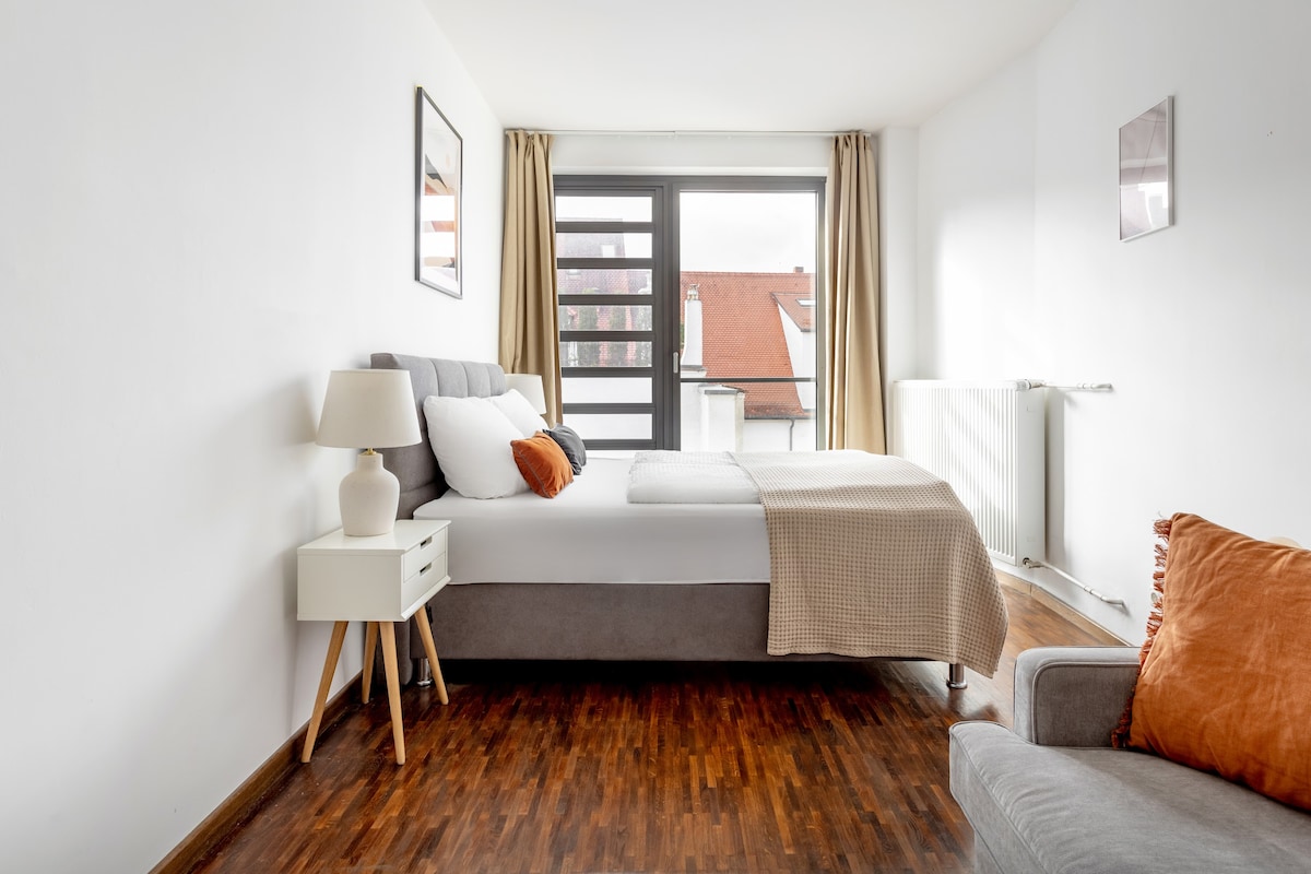 mirna atmosfera na rubu grada ( fantastično tiho) gdje je moguće opustiti se i odmoriti od svakodnevnice. 1 spavaća soba s bračnim krevetom 140 x 200, (dječja putna koliba je dostupna) 1 kuhinja sa rernom, frižiderom, mašinom za suđe, priborom za jelo i tanjirima 1 kauč za 1 ili 2 osobe 1 kupatilo /WC vlastiti stan sa separa. Dolazi s vlastitim parking mjestom. Samo 20 km od Memmingen aerodroma (München West) traje samo 15 minuta automobilom.