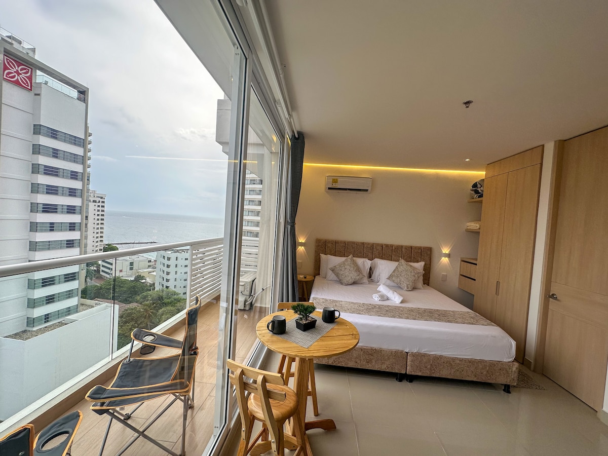 Uživajte u Santa Marti u ovom modernom stanu s balkonom i pogledom na okean, koji se nalazi samo nekoliko koraka od plaže. Opustite se u bazenu na 18. spratu s jacuzzijem i panoramskim pogledom na zaljev i iskoristite blizinu najboljih restorana, barova i turističkih mjesta u gradu. Idealno za parove, porodice ili prijatelje koji traže udobnost i vrhunsku lokaciju.