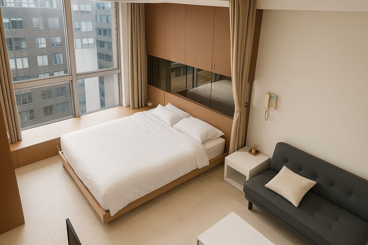 3 minute hoda do stanice Guting MRT, 1 minuta do autobuske stanice i UBIKE-a. Trgovine mješovitom robom i supermarketi su udaljeni 5 minuta hoda. Ovo je stan s liftom i 24-satnim osiguranjem. Uključuje mašinu za pranje/sušenje veša, TV, Wi-Fi od 100 Mbps, kauč na razvlačenje, ormar, toaletni stol/radni stol za računar, frižider s dvostrukim vratima, osnovnu kuhinju s priborom i odvojeni toalet s kompletnim kupatilom, uključujući grijalicu/izduvni ventilator (bez kade). Soba je uređena u mediteranskom stilu s visokim stropovima.