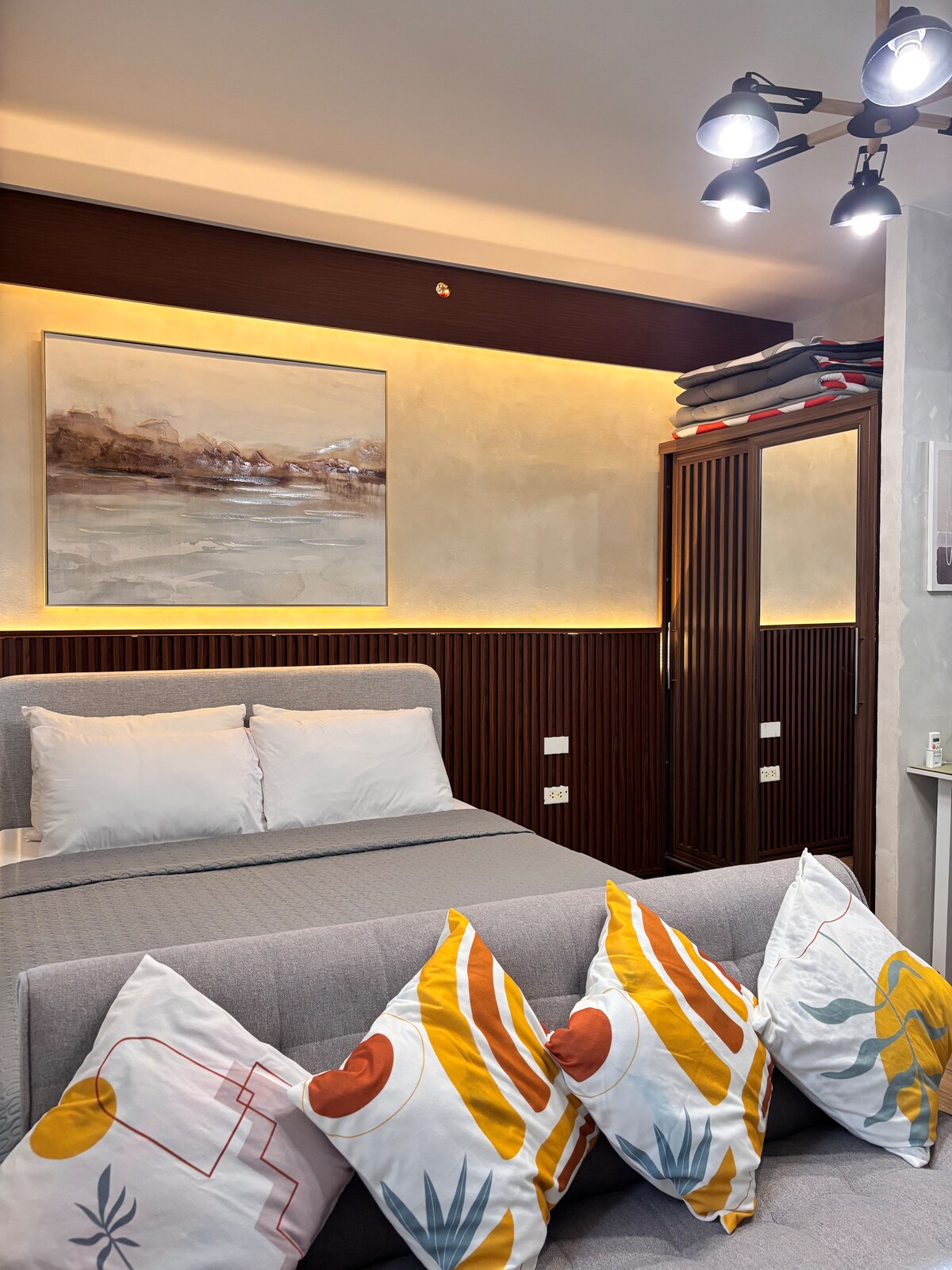 Jedan Regis može primiti do 6 gostiju (mogu se naplaćivati dodatni troškovi). Prostrani minimalistički 1BR kondominij s pogledom na bazen. Ova jedinica je potpuno namještena i dizajnirana za udobnost. Uživajte u klima-uređaju, brzom Wi-Fi mreži, opremljenoj kuhinji i modernom tušu u sigurnoj zgradi s osiguranjem 0-24. Savršeno za parove, putnike koji putuju sami, porodice ili profesionalce. Praktično se nalazi u blizini trgovačkih centara, restorana, kafića i prometnih čvorišta; čeka vas elegantno utočište u gradu!