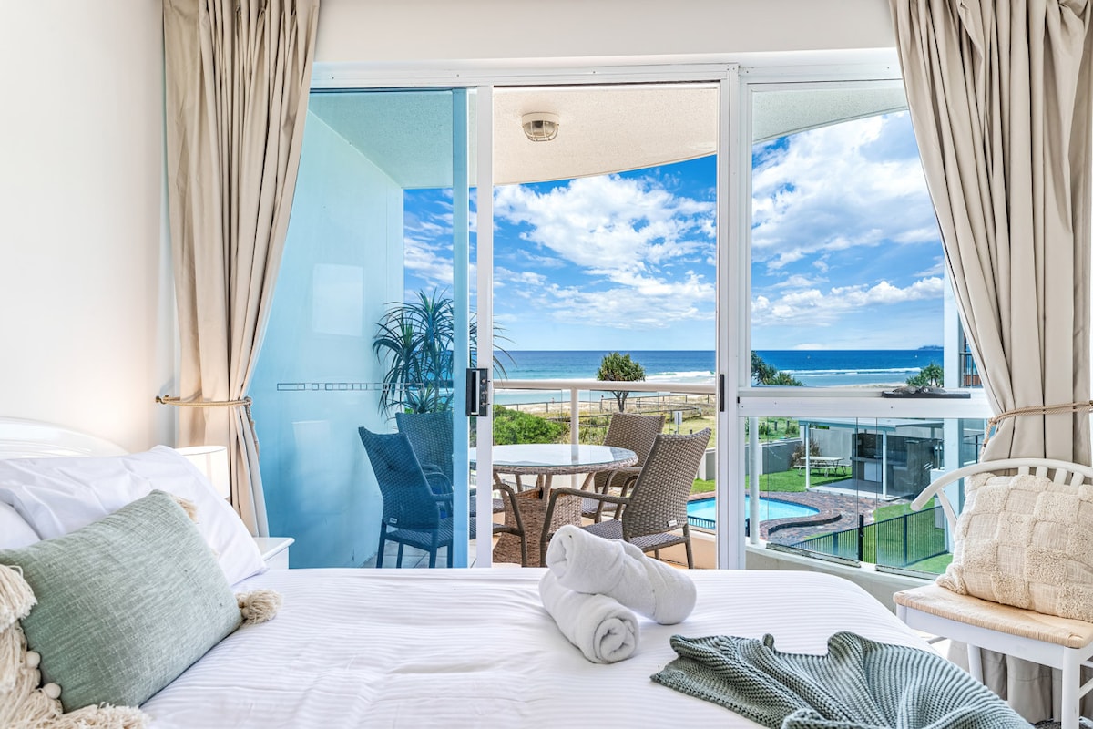 Welcome to our absolute beachfront apartment, perfectly blending coastal style with modern luxury 🌺 Wake up each morning as the sun rises over the horizon, casting a warm glow over your apartment, or sleep in with block-out blinds. Take advantage of the full size kitchen or stroll along the beach to the cafes at Tallebudgera creek. Relax in the cosy living area with a smart TV and streaming services 🍿