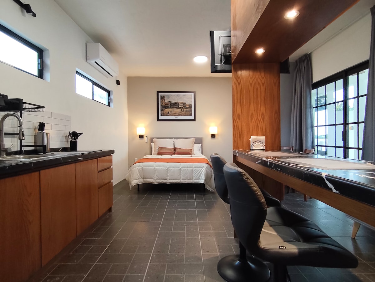 Loft con terraza privada es un espacio íntimo y tranquilo para una o dos personas con acceso independiente. Su terraza tipo rooftop, con pérgola y una cúpula única, es ideal para disfrutar el atardecer, cenar al aire libre o relajarte bajo el cielo de Tampico. Cuenta con cama matrimonial, cocineta equipada y un ambiente cómodo y acogedor, apto para relajación o home office. Ubicado en zona habitacional, cerca del centro histórico, la Laguna del Carpintero y a 20 min de Playa Miramar.