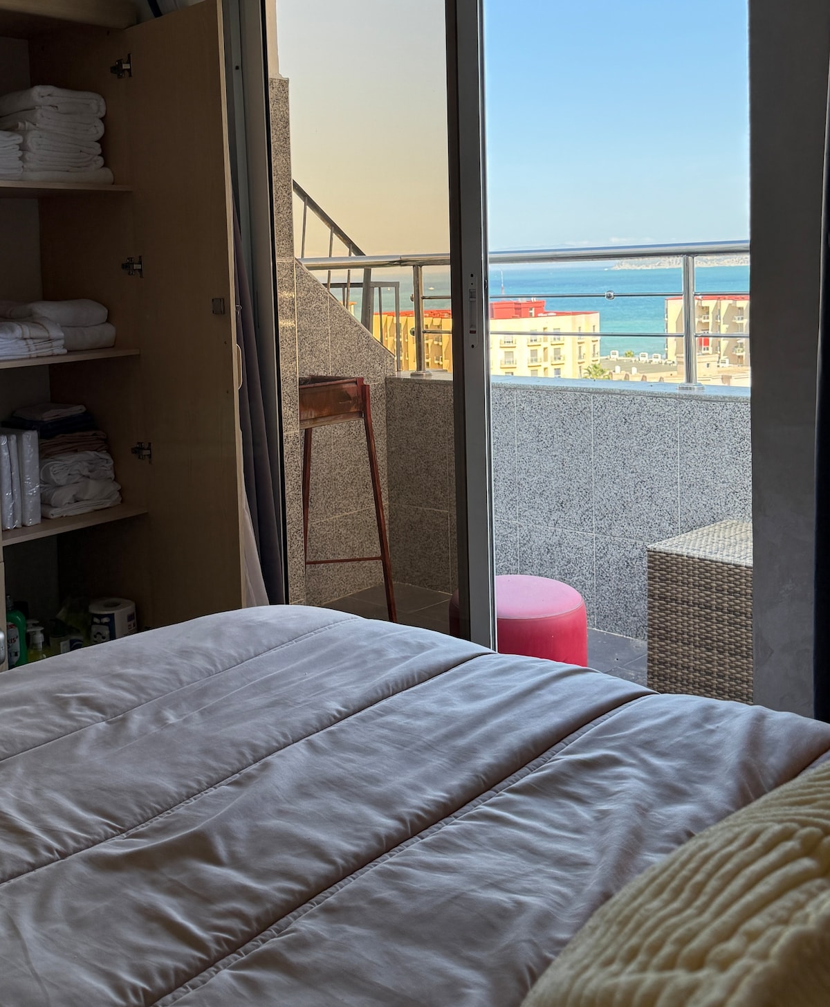Bienvenue dans notre Moderne Appartement à 2 pas de la plage 🏖️, idéal pour familles ou amis. -Chambre parentale avec lit standard et vue mer 🛏️. -Deuxième chambre avec deux lits 90cm une personne, vue mer. -Salon moderne et lumineux 🛋️ avec vue mer. -Balcon ensoleillé 🌅 vue sur mer. -Cuisine américaine moderne et équipée 🍴. -Calme, raffiné et proche des commodités : cafés, restaurants et promenade. Parfait pour un séjour inoubliable à Tanger.