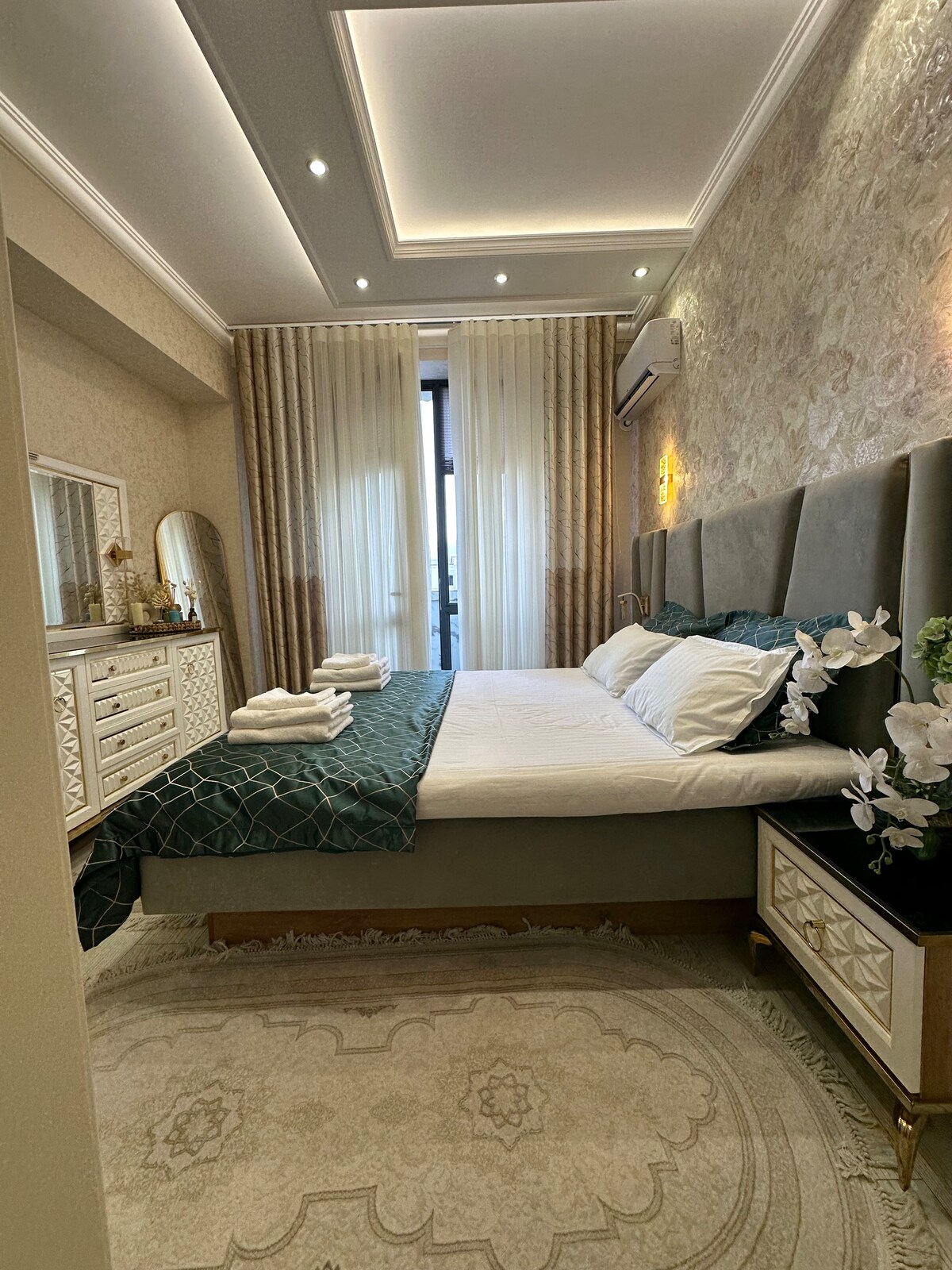Moderan stan u srcu Taškent Cityja | Stambeni kompleks Boulevard Osjetite udobnost i stil u ovom udobnom dvosobnom stanu od 60 m2. Unutrašnjost je izrađena u elegantnim svijetlosivim tonovima s mramornim detaljima i blagim osvjetljenjem. Prostrani balkon gleda na mirno dvorište sa zelenom površinom. Stan ✨ ima sve što vam je potrebno za nevjerovatan boravak: • Potpuno opremljena kuhinja (ugrađeni Boschevi uređaji, posuđe, čajnik itd. • Udobna spavaća soba s velikim krevetom i TV-om