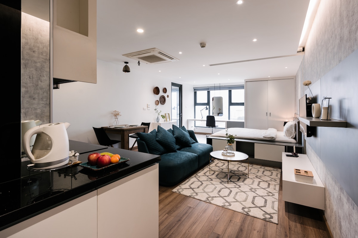 Smješten odmah pored centra Hanoja, naš stan pripada zgradi visoke klase D.'Le Roi Soleil s jedinstvenom umjetničkom arhitekturom, izvanrednim sadržajima i šarmantnim prirodnim ljepotama West Lakea. - Dnevna soba, kuhinja i spavaća soba su otvorene jedna za drugu - Oko 20 km od aerodroma Noi Bai. (BESPLATAN 1 način) - Samo 5' hoda do Westlakea i 15' do jezera Hoan Kiem, stare četvrti. - Zgrada trgovačkog centra Lion Mall s luksuznim komunalnim uslugama. Studio apartman je pogodan za 1 putnika ili 1 par