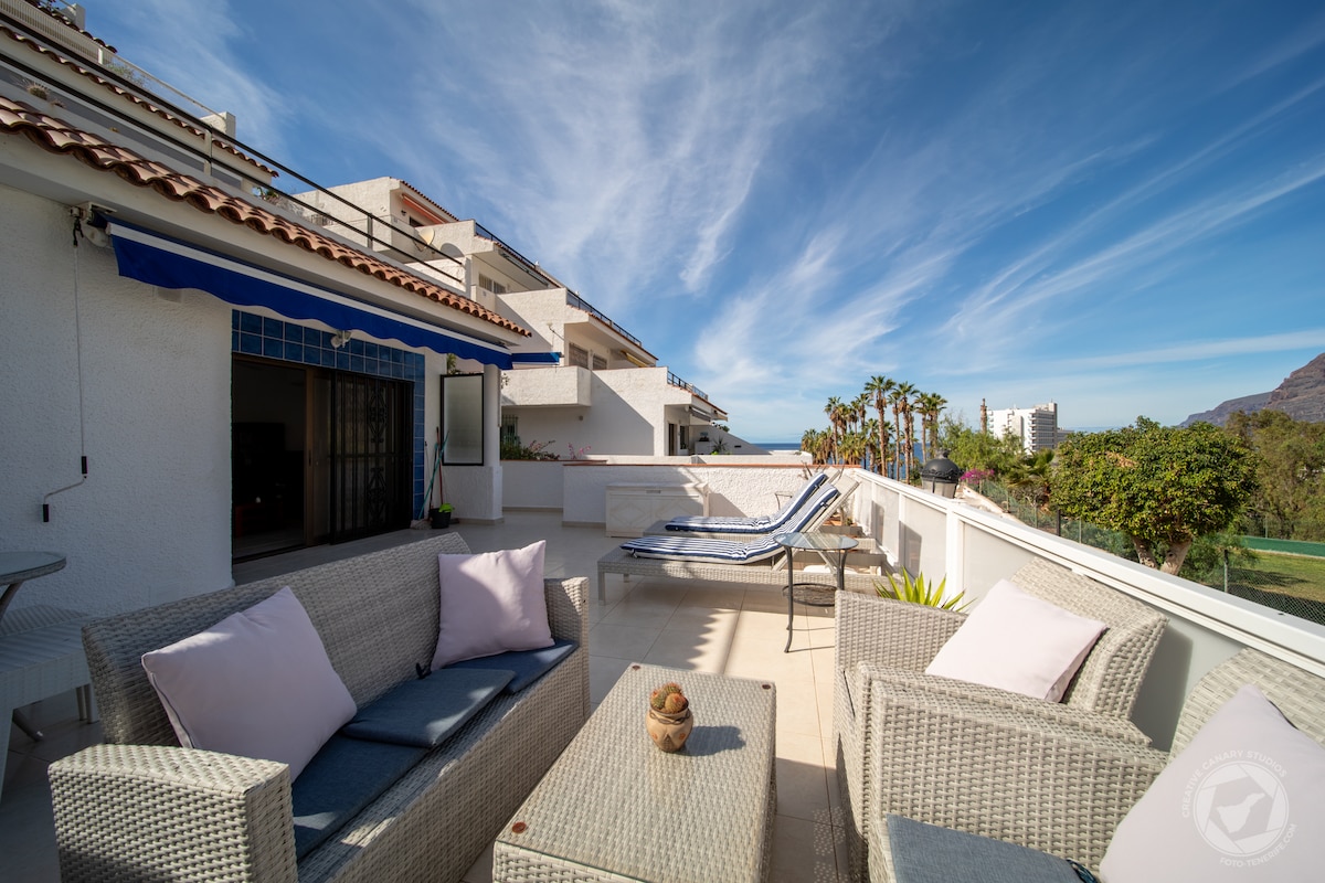 Beautiful apartment in a new modern luxury complex in Palm Mar. It has everything that you need for a comfortable stay: charming bedroom with a large bed (1.80m), 2 bathrooms, fully equipped kitchen (including dishwasher, oven, toaster, coffee machine, microwave, etc.), high speed Wi Fi, Smart TV. One parking place is available also. There are air conditioners in the living room and in the bedroom, which work very well while switching on simultaneously. You will feel cozy on a big and quiet south facing terrace (24m2) with large sofa enjoying nice view of the National reserve and ocean in private and romantic atmosphere. The view of sunset is also magnificent here. The living room is spacious and comfortable, large sofa with many pillows can be easily transformed into a comfortable double bed. There is a beautiful garden in the inner court of the complex and if you wish you can visit fitness center, also you can swim in one of two heated swimming pools or just burn under the sun. There is a supermarket, fruteria and Italian restaurants just across the street and a great amount of restaurants, bars, cafe on walking distance from the complex. You are very welcome!