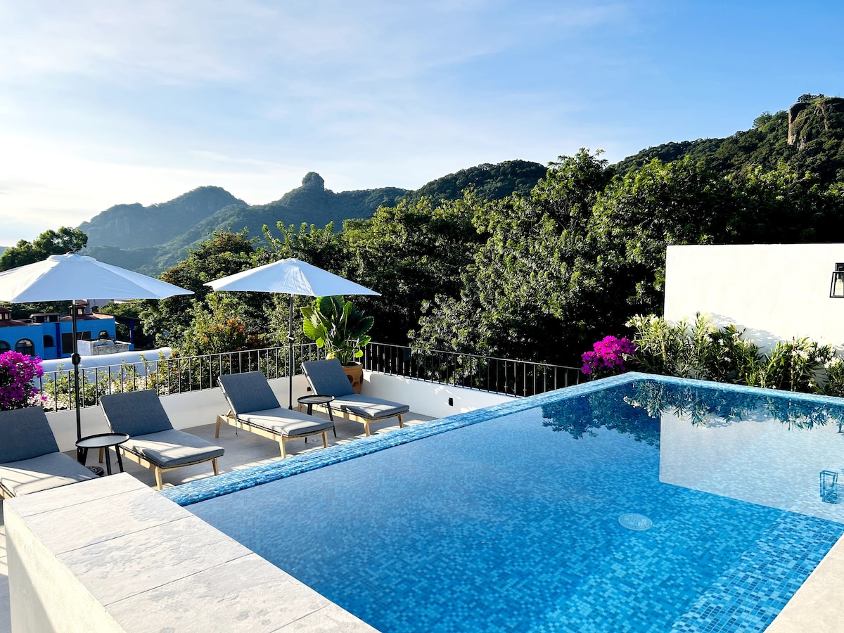 Primavera todo el año, recarga energía y conecta en este espacio rodeado de árboles y montañas, a las faldas del cerro, a un lado del río, hermosas vistas hacia donde voltées, alberca, chimenea, jardín, cerca de todas las principales atracciones, en la zona más exclusiva, dentro de uno de los Top 10 hoteles de Tepoztlán. Ideal para estancias largas y cortas; para trabajar a distancia, descansar, divertirse y compartir. Paz, tranquilidad, buena vibra.