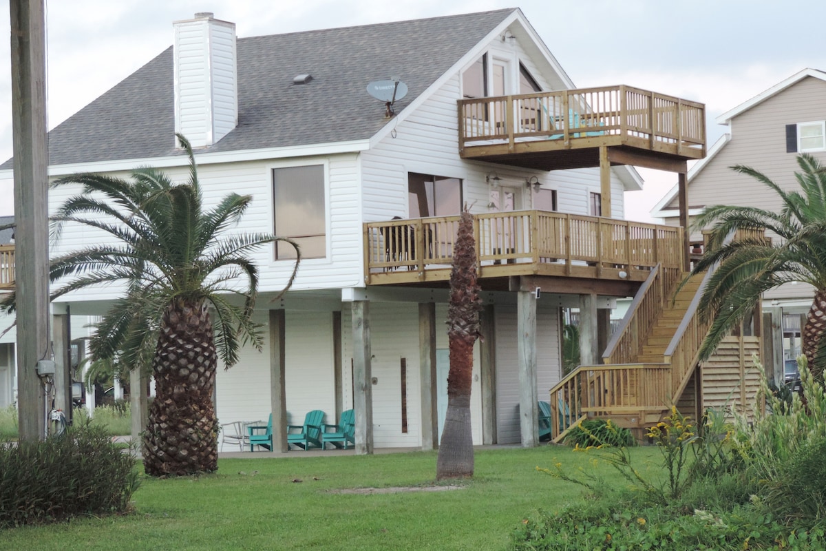 Opustite se s cijelom porodicom u našem čvrstom i novouređenom smještaju na plaži, udaljenoj nekoliko koraka od plaže. Naš veliki smještaj se nalazi na prostranom uglu i ima pogled na plažu i zaljev. Uživajte slušajući okeanske valove i zapanjujuće zalaske sunca dok pijuckate kafu ili vino s naše ogromne terase. Uživajte u s'moresima iz našeg vanjskog ognjišta. Naš dom nije tipičan Galveston AirBNB jer je to kuća za odmor naše porodice i vrlo dobro održavana.