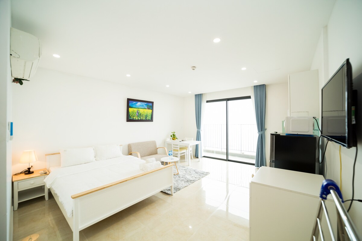* Ovo je lanac modernih stanova koji se nalaze u luksuznim stambenim kompleksima u Hanoju. D'apitale jedno od najboljih mjesta za život, svaki stan je ukusno uređen, besprijekorno čist i ima odličan pogled na grad, pogled na jezero s najboljih spratova. Nudimo savršen smještaj za parove, porodice ili samce. * Ovaj potpuno novi studio ima 1 bračni krevet, 1 privatno kupatilo, dnevni boravak s udobnim kaučem za opuštanje uz pametni TV od 60 inča.