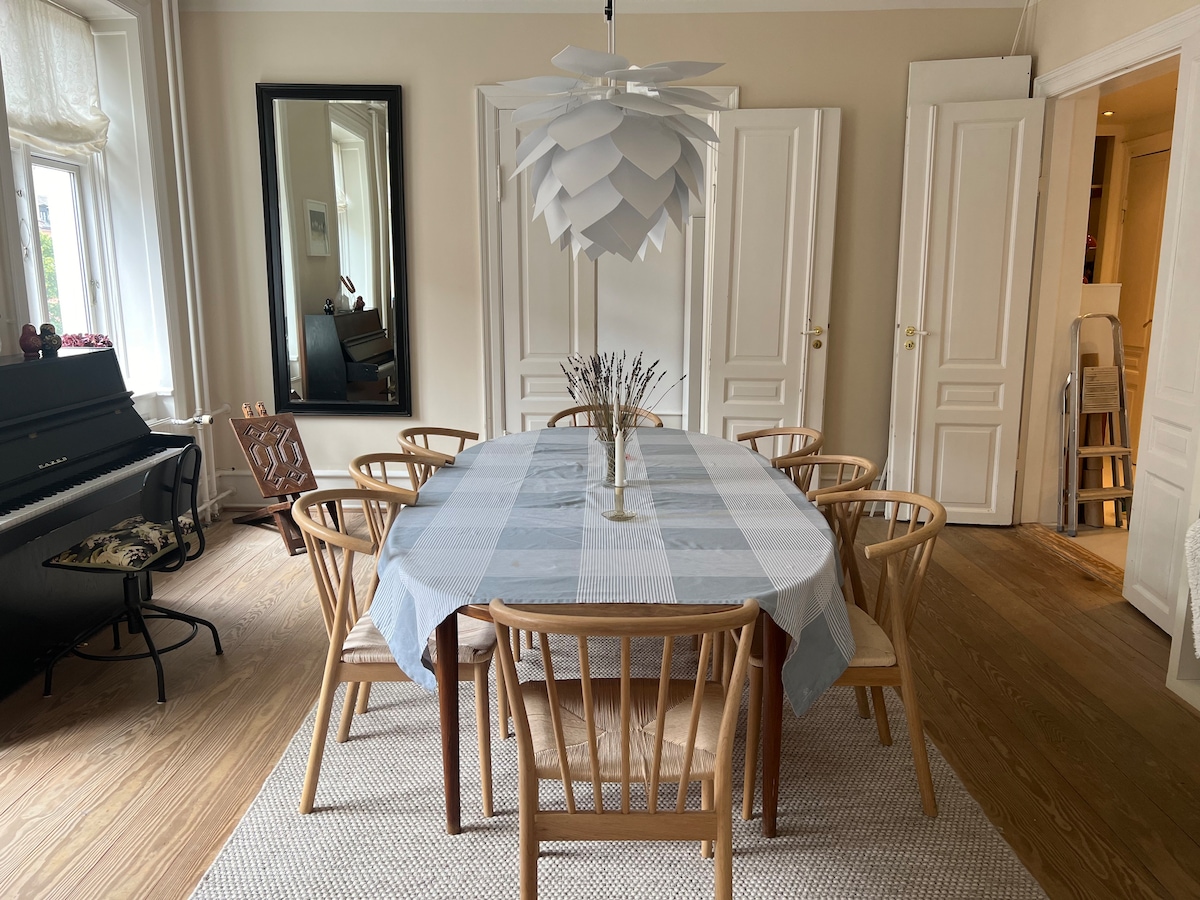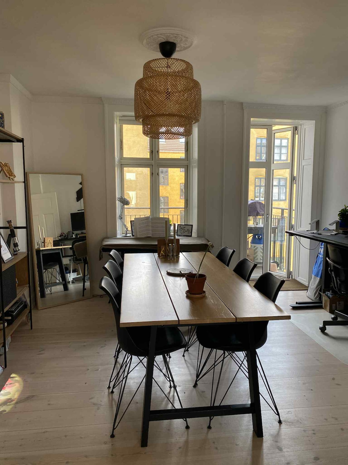 Lijep dvospratni stan od 130 kvadratnih metara u centru Kopenhagena. DNEVNA SOBA Dvije spavaće sobe i kupatilo s kadom i tušem u jednom PRVI SPRAT Velika kuhinja za druženje s prostorom za 6 gostiju koji jedu. Dvije povezane dnevne sobe, gdje je u jednoj radni stol - a u drugoj kauč i televizor. Moderan dizajn u inače vrlo staroj kući. Spratovi su povezani spiralnim stepeništem unutar stana. Iz kuhinje i toaleta možete vidjeti dvorište, stare krovove i toranj Vor Frelser crkve.