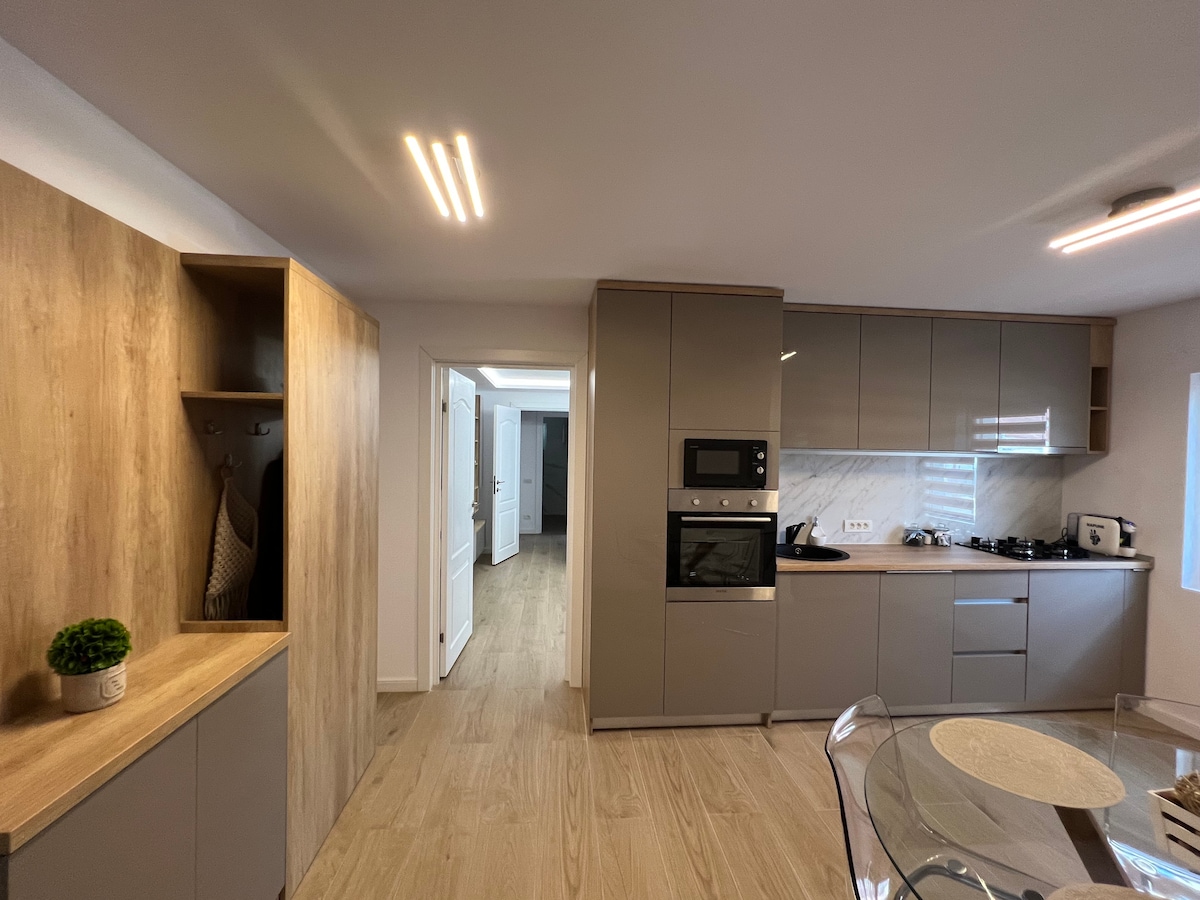 Svijetli i moderni stan u mirnom području Râmnicu Vâlcea, idealan za 2 odrasle osobe ili malu porodicu. Sadrži spavaću sobu s bračnim krevetom, dnevni boravak s kaučem na razvlačenje, potpuno opremljenu kuhinju i moderno kupatilo s tušem, mašinom za pranje veša i sušilicom. Gosti uživaju u brzom Wi-Fi i pametnom TV-u. Savršen izbor za opuštajući boravak, bilo da ste u slobodno vrijeme ili na kratkom poslovnom putovanju. Parking: Parking na ulici u blizini; plaća se tokom određenih sati prema lokalnim pravilima.