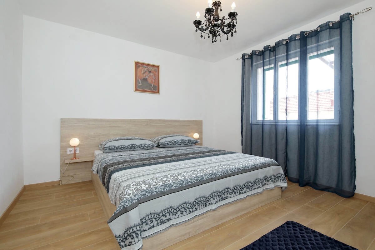Vrlo prostran i potpuno opremljen trosoban apartman za 6 osoba u mirnom dijelu 150m udaljen od mora sa prekrasnim pogledom. Udaljen je svega nekoliko minuta hoda od centra Tisnog.