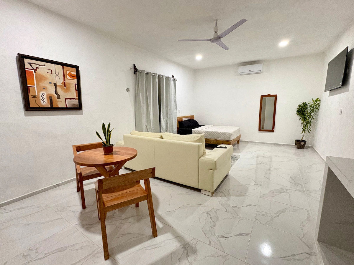 En reservas semanales 10% y 25% de descuento por mes. un cuarto con aire acondicionado, sala y comedor solo unicamente con ventiladores de techo. Servicio de Wi-Fi y TV con Max, y Disney+. Disfruta de esta bella residencia economica con tus familiares y amigos. Cocina equipada con los instrumentos basicos. El baño cuenta con agua caliente. Ubicada en un luagar tranquilo de la ciudad.