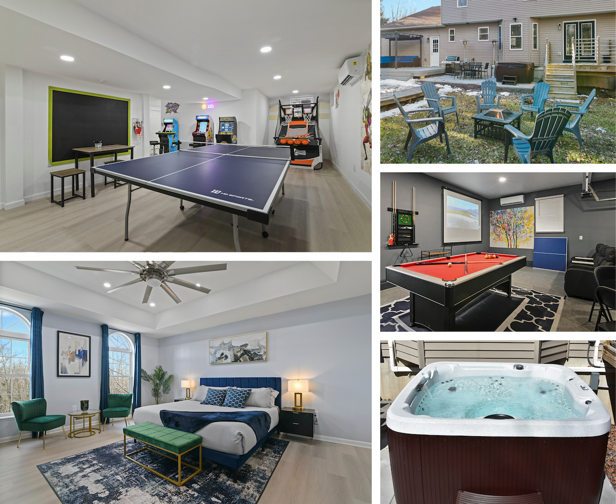 ☞ 10 person hot tub ☞ Pool table ☞ Community Fees included (see listing) ☞ King bed ☞ Ping-pong table topper ☞ Arcade infinite game table ☞ 440 Mbps WiFi *”Lovely place and amazing hostess” ☞ 4 smart TVs ☞ Pet friendly ☞ BBQ (gas provided) ☞ Fully equipped kitchen ☞ Self check-in ☞ Onsite washer + dryer ☞ Fireplace ☞ 24/7 security ☞ 15-30 mins- skiing, snow tubing, indoor water parks: Camelback, Kalahari, Jack Frost & Big Boulder ski mountains; Pocono Premium Outlets, Mount Airy Casino, etc.