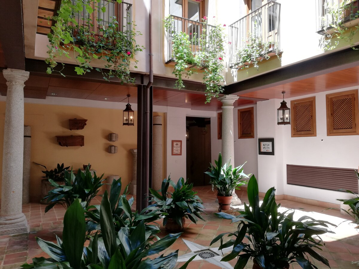 Duplex in a traditional Toledan courtyard, just 200 metres from the Cathedral, fully equipped with all amenities. Maximum capacity: 6 guests (4+2). The apartment features 2 air-conditioned bedrooms, 3 bathrooms, Movistar Plus, and WiFi, located in the heart of the historic centre within a beautiful traditional Toledan courtyard building in a peaceful area. Private parking (subject to availability). Additional fee: €20 per night car. Fast check-in completion is required.