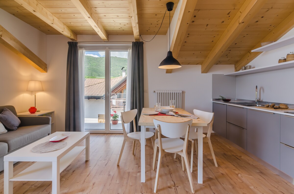 OTVORENO OD JUNA DO OKTOBRA Prostran i svijetao stan koji se nalazi na prvom spratu seoske kuće (stara seoska kuća), nedavno renovirana nudi 2 spavaće sobe s nezavisnim kupatilom. Dnevni boravak, info tačka, balkon, terasa, vrt. Kuhinja je na spratu ispod. Gostoprimljivo, dobro održavano, šareno, jednostavno i originalno okruženje. Pogled na Brenta Dolomite okružene stablima jabuka. Parking u unutrašnjem dvorištu i garaža.