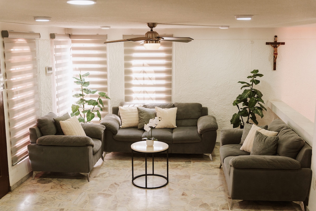 Uživajte u udobnom boravku u našem dvosobnom stanu i kauču na razvlačenje dok posjećujete grad. Ovaj smještaj nudi opuštenu atmosferu, ima kupatilo, kuhinju, terasu i parking. 5 minuta od pijeska Guadalajara, zoološkog vrta, čarobne džungle, kanjona Huentitan, oblata, trga nezavisnosti. ograde stadiona Jalisco, Akron, centar Guadalajare, 30 minuta od aerodroma. Možete pronaći i obližnje prodavnice, prodavnice i apoteke.