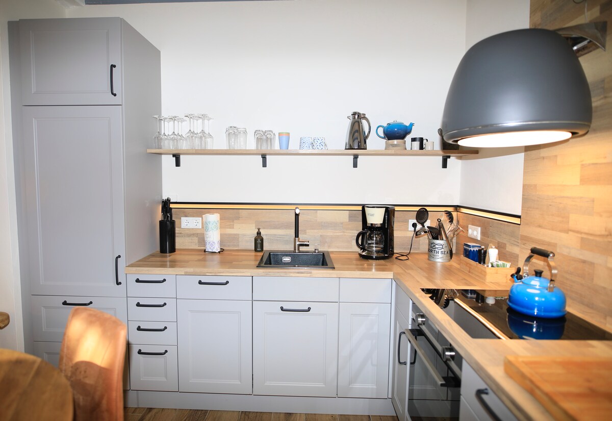 Ljubazno i pažljivo, stvorili smo fantastičan stan na 70 kvadratnih metara za 2 ( do 4) osobe na 2 nivoa s mnogo strasti - prostor za spavanje se nalazi na gornjem spratu ispunjenom svjetlošću. Pobrinite se da su jedina vrata vrata kupatila - ostalo je otvoreno. Pokušali smo izgraditi što je moguće održivije, ekološke i kvalitetnije - boje su iz sezone kreka na bazi vode.