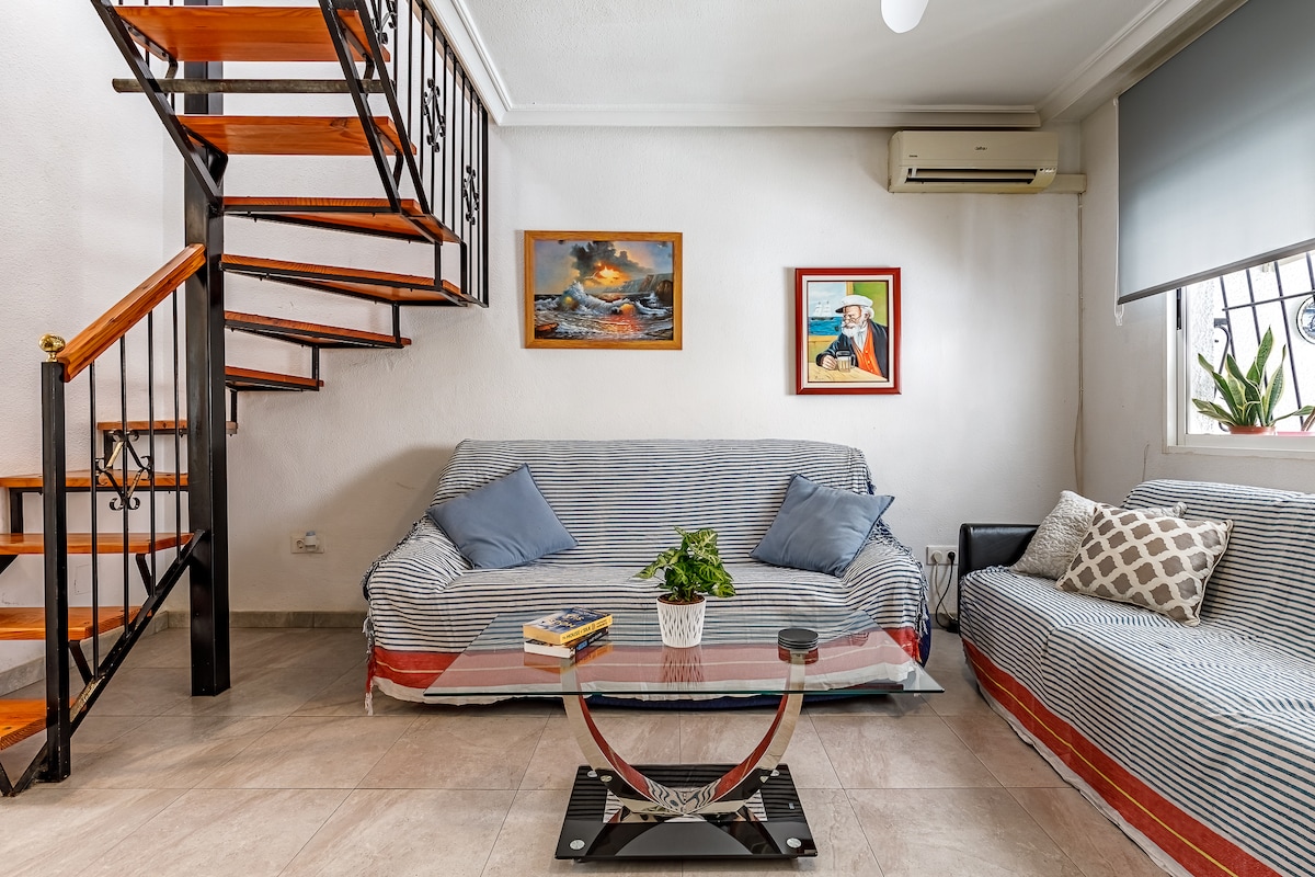 Moderan i udoban novouređeni bungalov s privatnom krovnom terasom i zajedničkim bazenima u blizini plaže. 800m od plaže. 90 m² Na prvom spratu se nalaze 2 spavaće sobe, svaka s balkonom i kupatilom s tušem. Spavaće sobe imaju dva bračna kreveta dimenzija 150x200 cm. Kauč na razvlačenje (1,50 x 2,00 m) Najveći tržni centar, Zenia Boulevard, sa svojih 150 prodavnica i brojnim restoranima, udaljen je samo oko 300 m od vaše kuće za odmor.