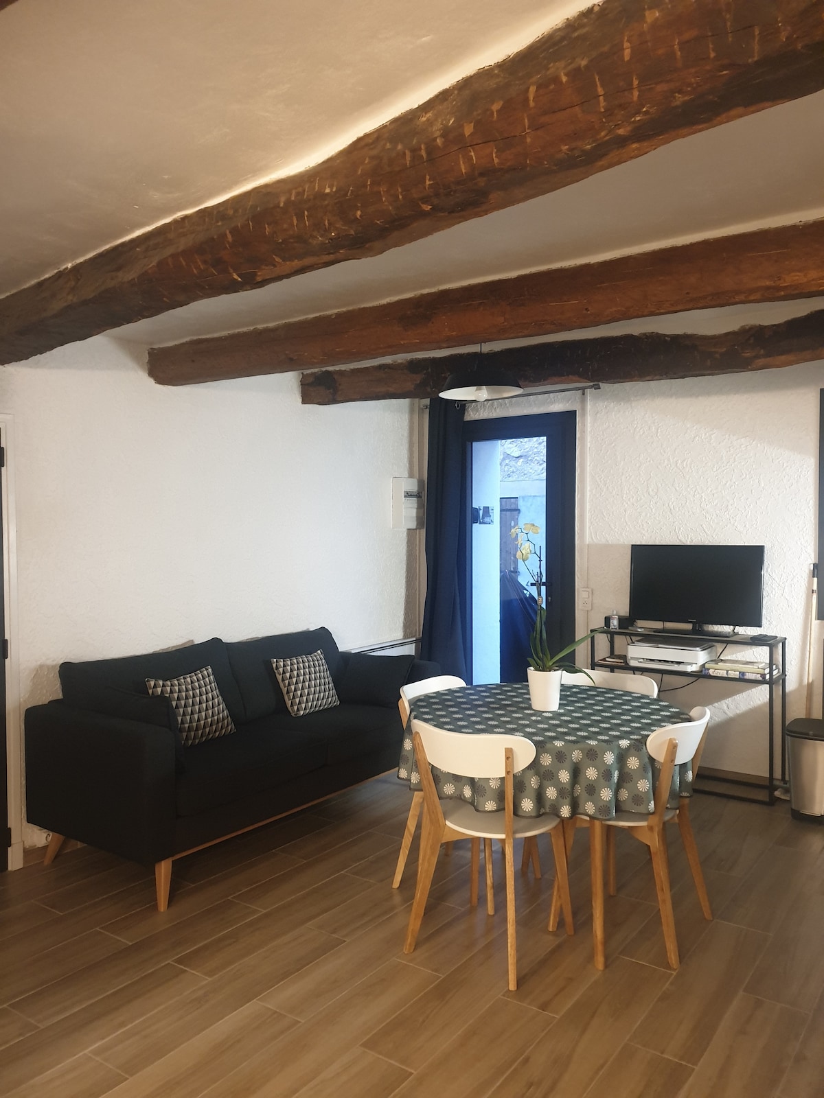 Srce historijskog centra - šarmantna i svijetla kuća u nizu . Privatni ulaz s vešerajom i sobom za bicikle. 1. sprat: 2 šarmantne spavaće sobe s bračnim krevetima, jedna tuš kabina s WC školjkom pored jedne od soba, potpuno opremljena kuhinja koja se otvara na svijetloj trpezariji. 2. sprat: Dnevni boravak s kaučima, cheminéeom i radnim stolom s pristupom prekrasnoj terasi opremljenoj ljetnom kuhinjom s pogledom na brda, dolinu i selo Klima uređaj Javni parking 5mn hoda Dodatni kreveti na zahtjev.