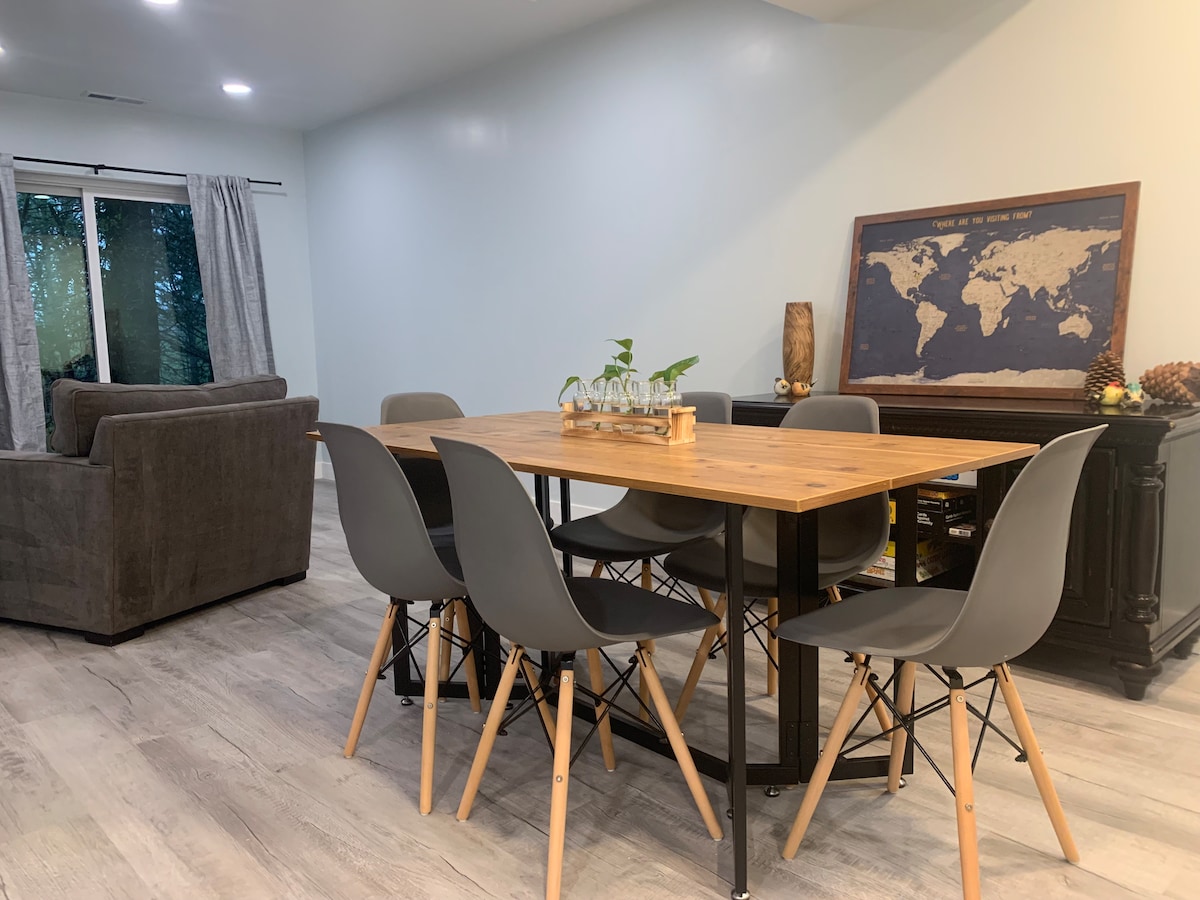 Veliki, prekrasan apartman koji je osvijetljen modernim dekorom. Ovaj apartman je potpuno privatan i odvojen koji obuhvata donji sprat smještaja u stilu ranča. Ima zaseban ulaz bez ključa, prilaz i terasu s ognjištem. Veliko dvorište sa starim hrastovima i pogledom na planine sa 18 minuta hoda do centra grada. Nedavno renovirana s velikom bračnom spavaćom sobom i velikim dnevnim boravkom s TV-om od 55 inča. ** KORISTITE PROČIŠĆIVAČ ZRAKA VOLL KOJI ISKLJUČUJE VIRUSE I BAKTERIJE IZMEĐU GOSTIJU**