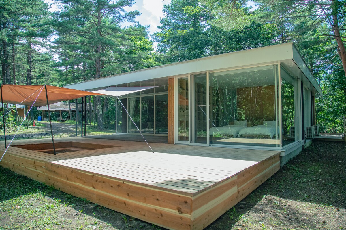 [Kita-Karuizawa Forest Villa NO9 Precious] Ova elegantna i simpatična kontejnerska kuća je vila za iznajmljivanje koja se nalazi pored hotela Asama Kogen.To je poseban prostor koji može primiti 2 do 4 osobe, s prostranom dnevnom spavaćom sobom od 15-tatami i kupatilom sa 6-tatami sa samostojećom kadom. Prostor za opuštanje i sadržaji 1 bračni krevet + kauč i madrac za najviše 4 osobe Kupatilo s kadom za noge za mačke: s funkcijom kupanja u obliku mjehurića.Možete uživati i u poluotvorenom kupatilu kada otvorite vrata Frižider-zamrzivač i mikrovalna pećnica Nema kuhinje, ali se potreban pribor (daska za rezanje, nož, pribor za jelo itd.) može iznajmiti u hotelu prilikom dolaska Doživite izvanrednu prirodu Natkrivena drvena terasa: Roštilj (dodatnih 5.500 jena) se može uživati čak i po kišnom vremenu