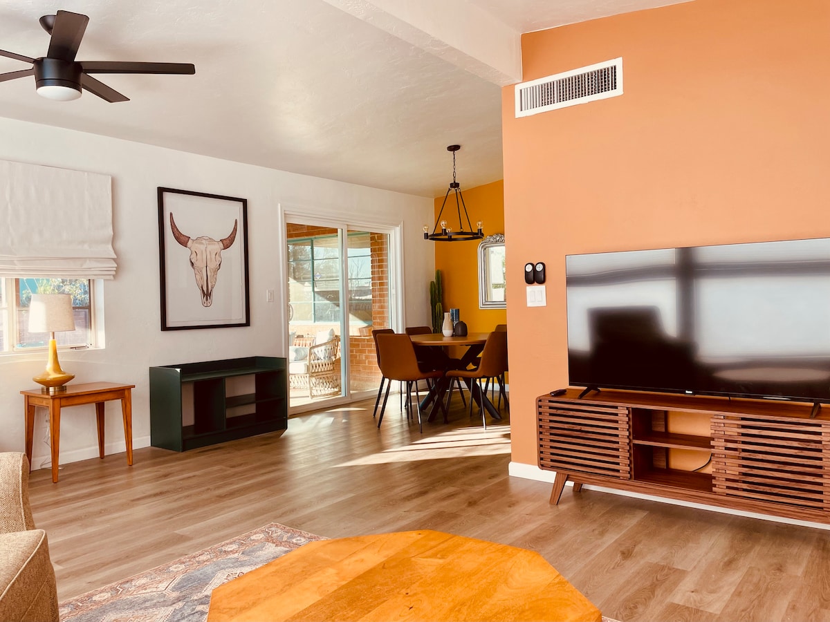 Skriveni dragulj u Tucsonu! Kuća je klasična kuća u stilu Santa Fea. Uživajte u svim udobnostima doma, opustite se u prekrasnom, skrovitom, potpuno ograđenom dvorištu s privatnom hidromasažnom kadom i bazenom. Trpezarija može primiti do 8 osoba, kuhinja je u potpunosti opremljena svim osnovnim potrepštinama. Postoji mali i funkcionalni kancelarijski prostor sa štampačem i papirom, kao i vešeraj. Postoje 3 udobne spavaće sobe s pametnim televizorima, brzim internetom, visokokvalitetnom posteljinom i stropnim ventilatorima.
