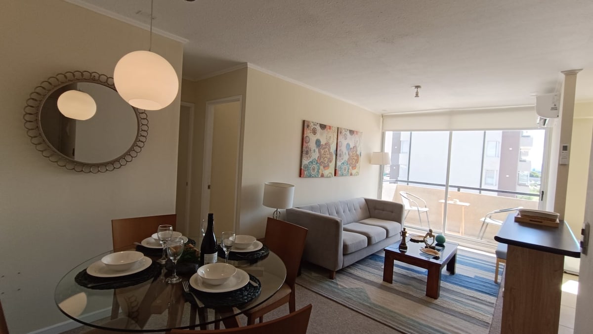 Moderno y nuevo departamento residencial con seguridad 24h y estacionamiento. A 10 min del centro, cerca de servicios y carretera. 2 dormitorios matrimoniales, Wifi, Smart TV, A/C, terraza y cocina equipada (cafetera, microondas, aceite, condimentos, té, azúcar). Somos Superanfitriones y tenemos otro depto. con muy buenas reseñas.!! Limpieza y comodidad nos caracteriza.