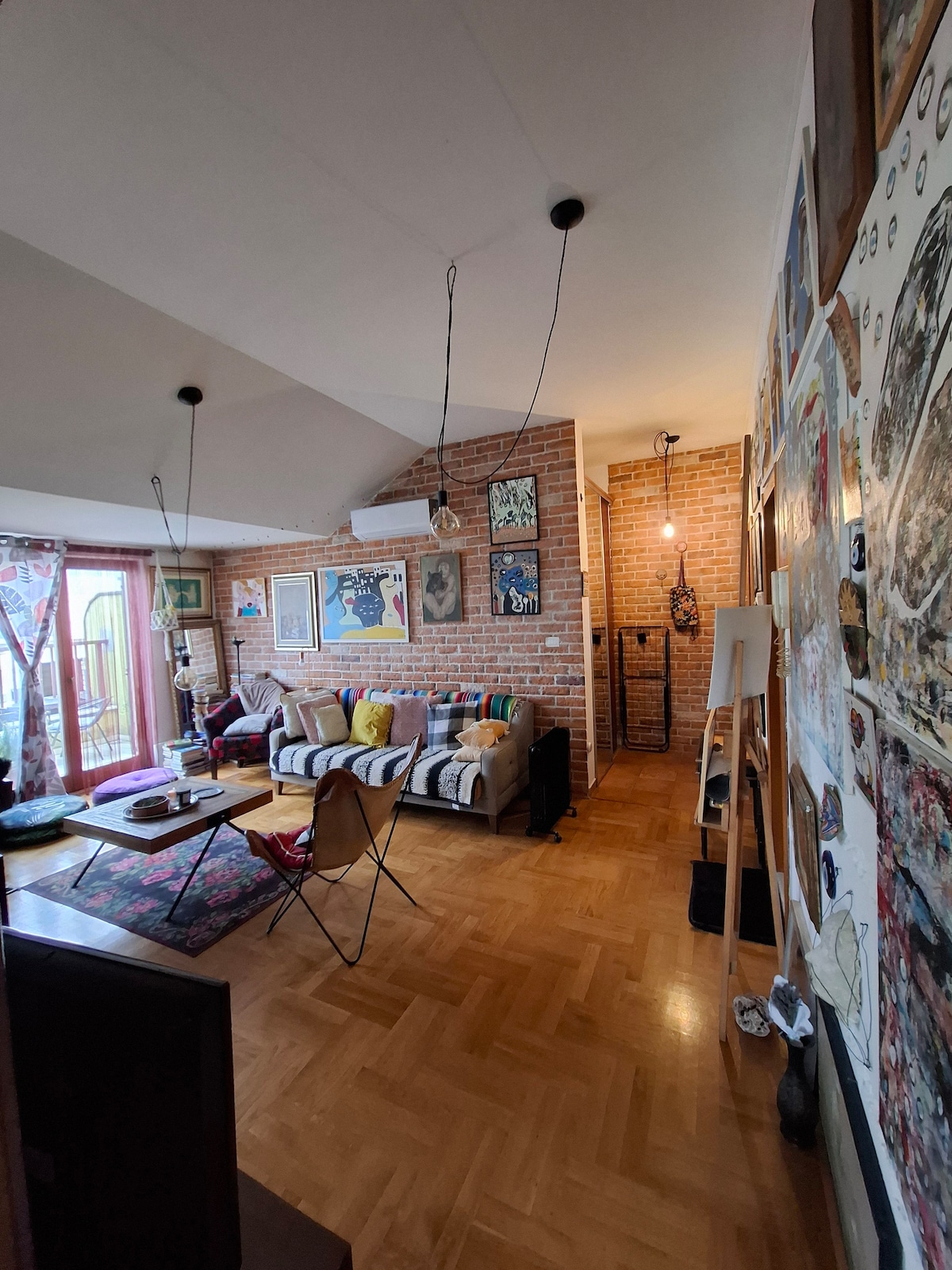 Opustite se u ovom jedinstvenom i mirnom smještaju za kratak odmor. Stan se nalazi u Podgorici na Starom Aerodromu. Potkrovlje, opremljeno modernim stvarima, ono što ga čini posebnim je velika prostrana terasa koja ima 20m2, puna zelenila sa prekrasnim pogledom na grad. Stan ima dušu, pozitivnu energiju, ko god je boravio u njemu, naglašava upravo to. Umjetnost je u svakom kutku stana, a šarm pariških potkrovlja je precrtan u apartmanu, galeriji. Mir, toplina, stil, šarm. Karakteristike našeg apartmana.