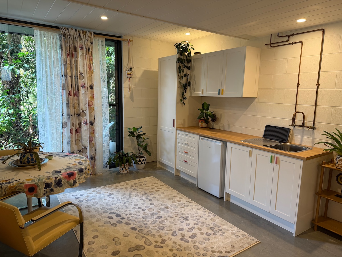 Cosy Studio with its own private access and entrance, set in a beautiful tranquil garden setting. As we also live on the property in the main house - you may hear some family noise from upstairs from time to time and we also have a very friendly Lab dog - Nellie. With no TV, but unlimited Wifi, you will have plenty of time to watch movies or relax and listen to the bird life. The Creek and Village are a 15 minute walk away along the beautiful boardwalk. No Smoking.
