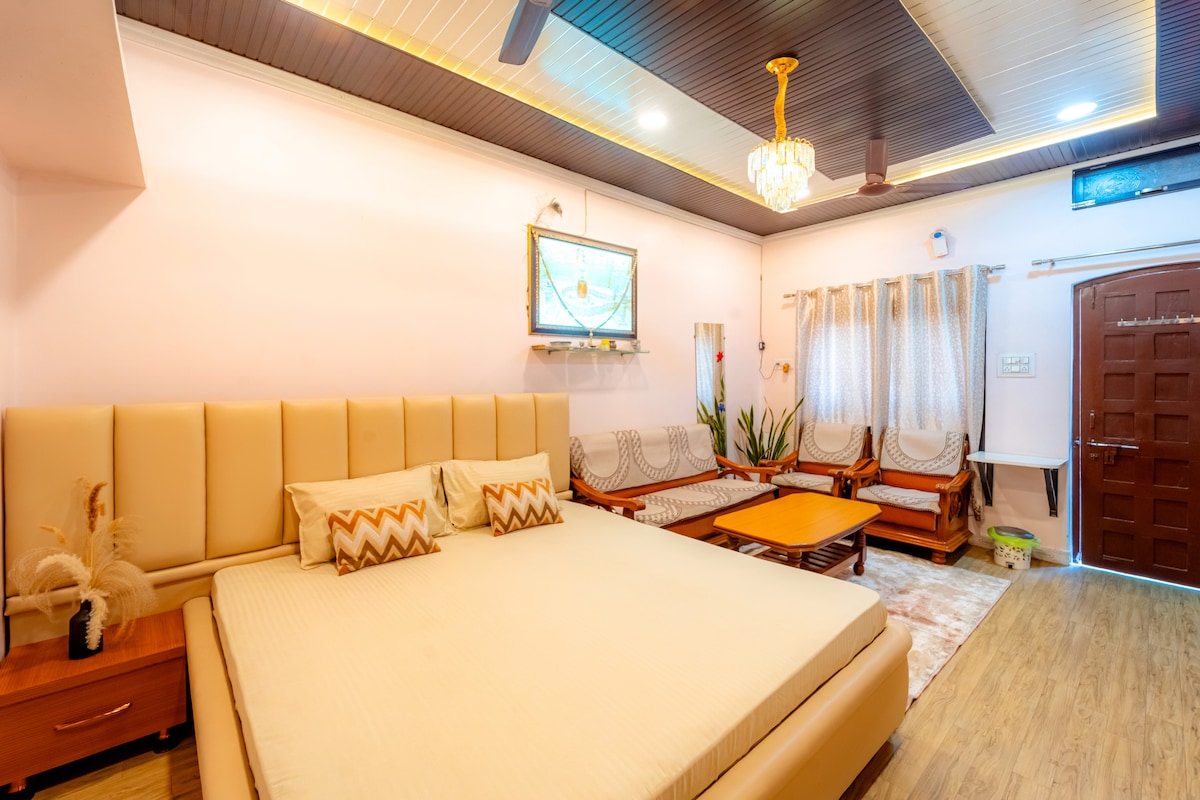 Otkrijte savršenu mješavinu moderne udobnosti i rustikalnog šarma samo 2,8 km od Mahakal Loka. Ovaj privatni 2BHK smještaj je idealan za putnike koji traže praktičan i spokojan boravak u Ujjainu. 2 prostrane spavaće sobe: Udobni kreveti, spremište i prirodno svjetlo. Glavna spavaća soba ima kupatilo sa sobom. Dnevni boravak: klima-uređaj, kauč na razvlačenje, veliki TV ravnog ekrana i rustikalni dekor. Potpuno opremljena kuhinja: Uključuje frižider, šporet i sve potrebno posuđe. 2 toaleta: Elegantna kupatila s osnovnim toaletnim potrepštinama.