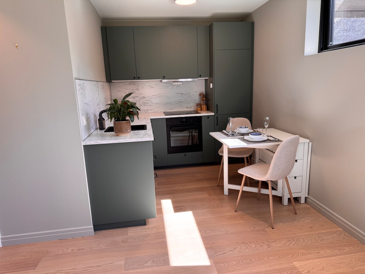 Moderan studio od 28m² s privatnim ulazom u potpuno novoj kući. Uživajte u udobnom bračnom krevetu, elegantnom dnevnom boravku, potpuno opremljenoj kuhinji i prostranom kupatilu s tuš kabinom. Veliki prozori unose prirodno svjetlo, a grijani podovi održavaju stvari udobnim. Savršeno za samostalne putnike ili parove koji traže miran boravak s jednostavnim pristupom prirodi i gradu. Brzi Wi-Fi, trpezarija za dvoje i vanjska garnitura za sjedenje su uključeni.
