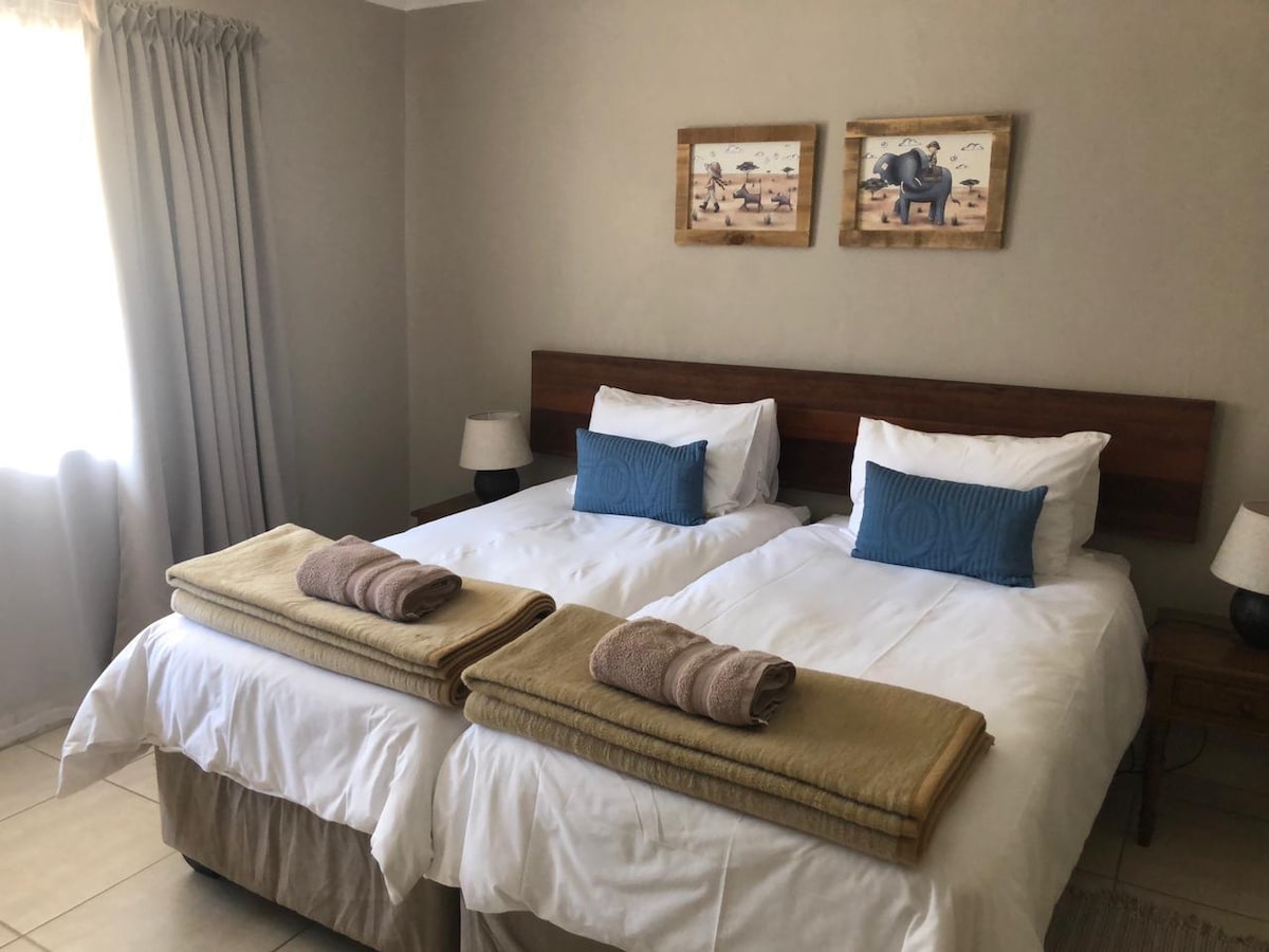 Twin room (two single beds) with bathroom with bath and shower. Kettle with tea/coffee supplies. DSTV (selected channels). Serviced daily. Laundry service available. Limited WIFI. Communal kitchen, dining and braai area available for self catering.